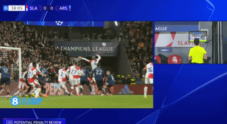 第30分钟,阿森纳开出右路角球至禁区内,前点普罗沃德争顶时,手臂将球挡出底线,随后VAR介入,主裁判观看视频回放后判给阿森纳点球,萨卡主罚命中,阿森纳1-0领先!↓