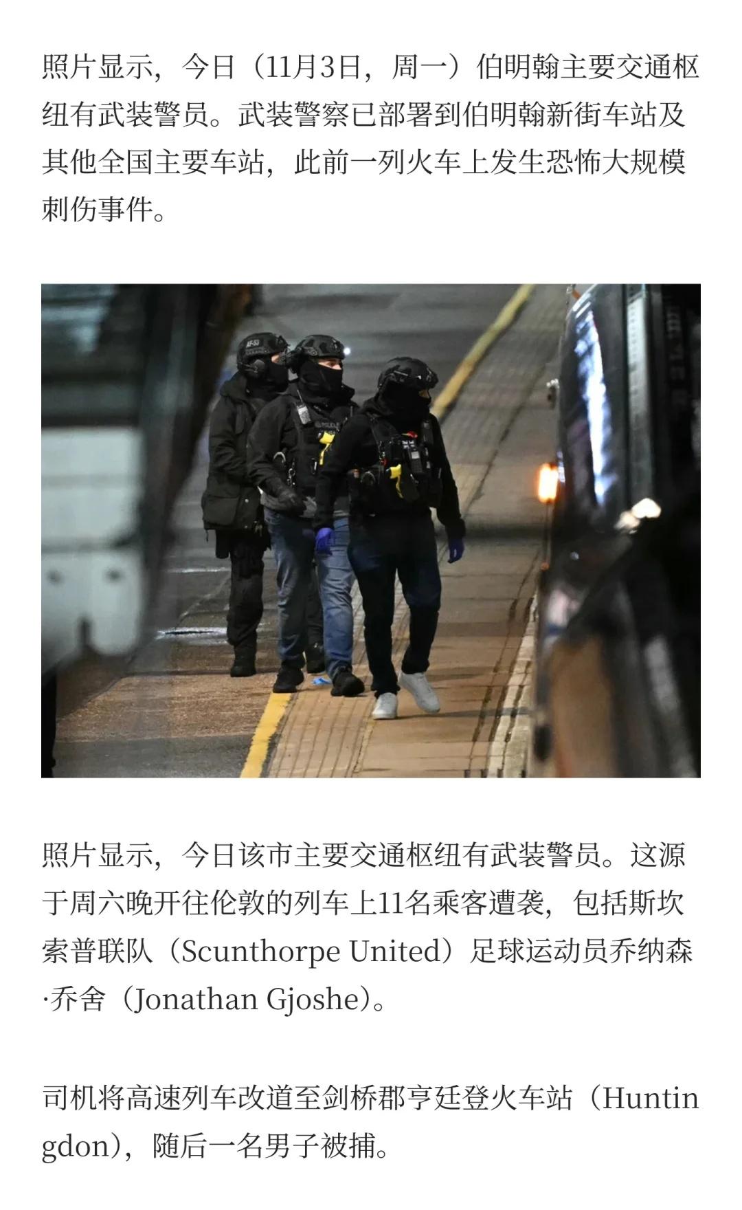 伯村布置大量的武装警察以增强市民的安全感 照片显示,今日(11月3日,周一)伯明翰主要交通枢纽有武装警员。武装警察已部署到伯明翰新街车站及其他全国主要车站,此前一列火车上发生恐怖大规模刺伤事件。亨廷登火车站 新闻 生活 英国火车站伤人 伦敦生活 伦敦 英国