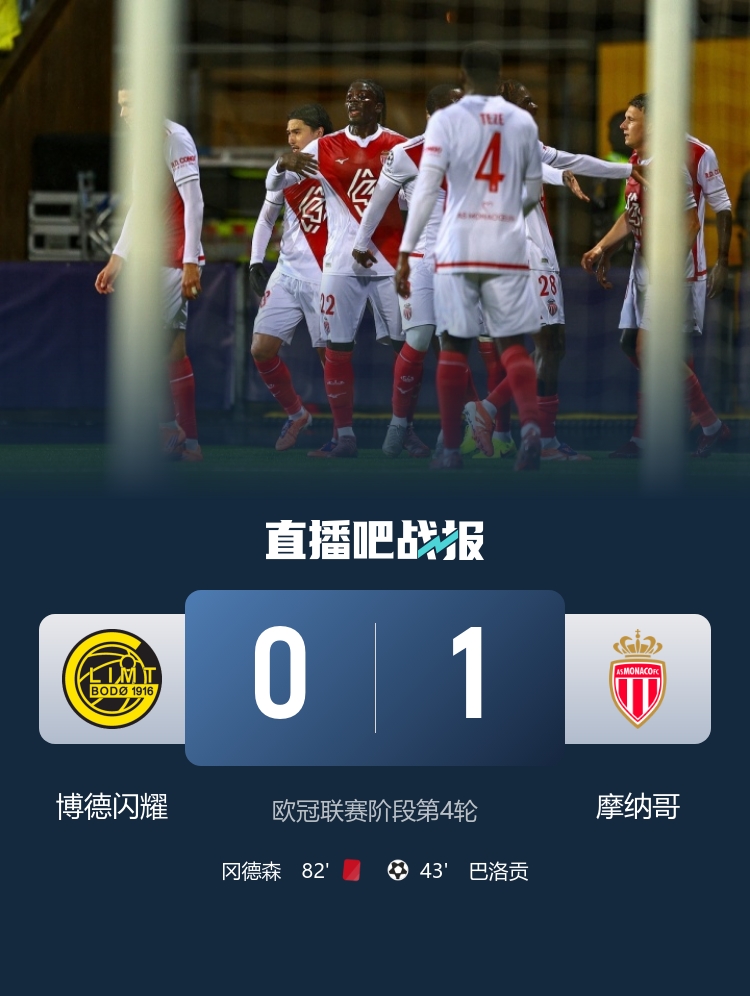 直播吧11月5日讯北京时间11月5日凌晨4时整,2025-26赛季欧冠联赛阶段第4轮在豪格桑德球场展开角逐,博德闪耀主场迎战摩纳哥。上半场巴洛贡打破僵局,阿克利乌舍助攻,霍格中柱,下半场摩纳哥门将库恩神扑,冈德森蹬踏被直红罚下。最终摩纳哥客场1-0战胜十人博德闪耀,摩纳哥取得本赛季欧冠首胜,博德闪耀欧冠4轮不胜。