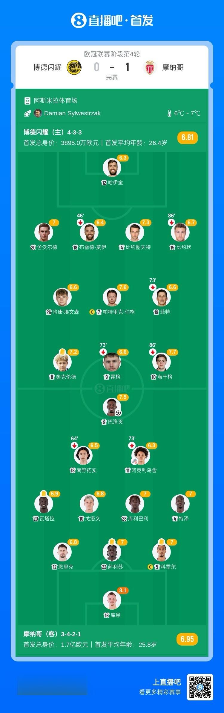 全场比赛结束,摩纳哥客场1-0战胜十人博德闪耀。