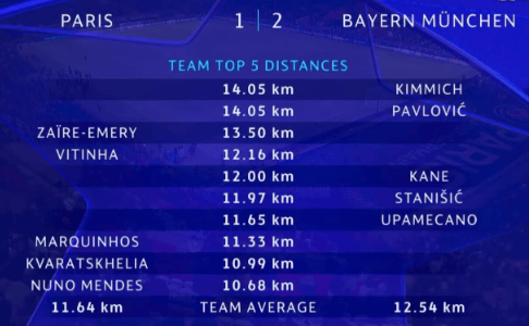 在半场少打一人的情况下,拜仁队内的平均跑动距离依然要明显高于巴黎。