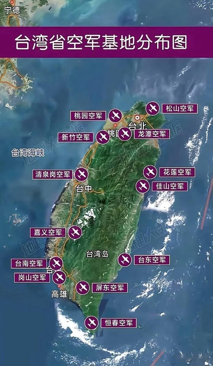 台湾省空军基地分布图(公开信息,仅供参考) 桃园空军基地: 位于桃园市,曾是重要的空军基地,现在主要作为空军桃园基地使用。 新竹空军基地: 位于新竹市。 龙潭空军: 位于桃园市。 松山空军: 位于台北市,与松山机场共用。 清泉岗空军基地: 位于台中市,是台湾规模最大的空军基地之一,拥有一条长3700米的跑道,是军民两用机场,部署有IDF战斗机。 嘉义空军: 位于嘉义县,与水上机场共用,是军民两用机场,部署F-16战斗机。 花莲空军 (佳山空军基地): 佳山基地位于花莲,被认为是远东最大的地下空军基地之一,部署有F-16战机。 台东空军 (志航基地): 志航基地位于台东,曾是飞行员培训基地,未来计划部署F-16V战机。 台南空军: 位于台南市,是军民两用机场。 冈山空军: 位于高雄市。 屏东空军: 位于屏东县。 恒春空军: 位于屏东县。