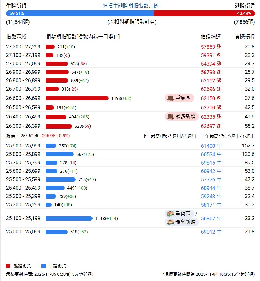 中信证券牛熊证街货分布图中的数据显示,熊证街货重货区在26600-26699区间,该区间最新熊证数量为1498张,较上一交易日增加68张;熊证街货最多新增在26400-26499区间,该区间最新熊证数量为494张,较上一交易日增加205张。