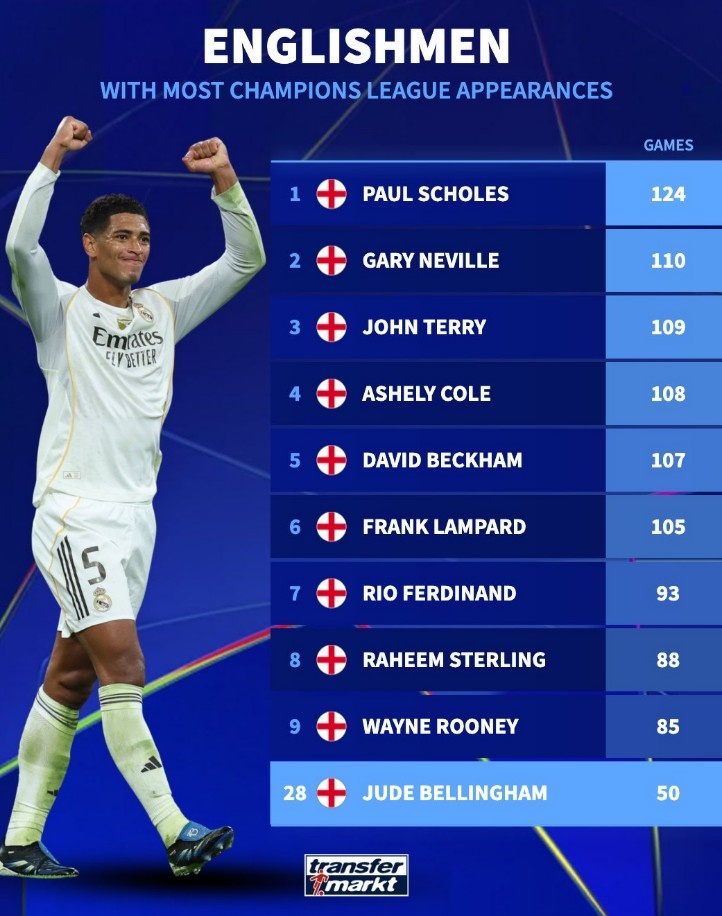 直播吧11月5日讯在本轮欧冠,利物浦1-0击败皇马。贝林厄姆完成生涯50场欧冠里程碑,德转也盘点了英格兰球员欧冠出场次数榜,具体如下: