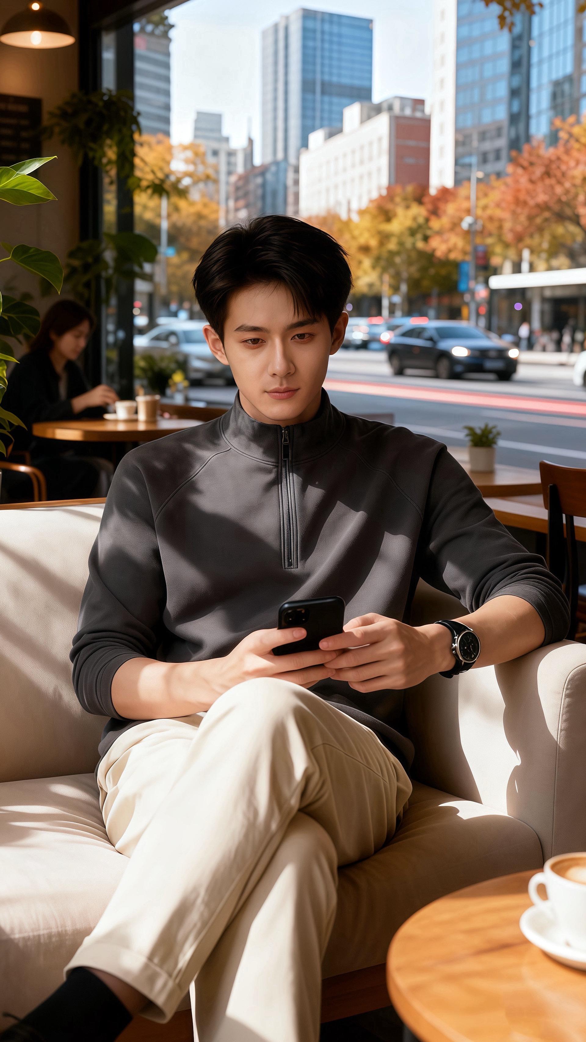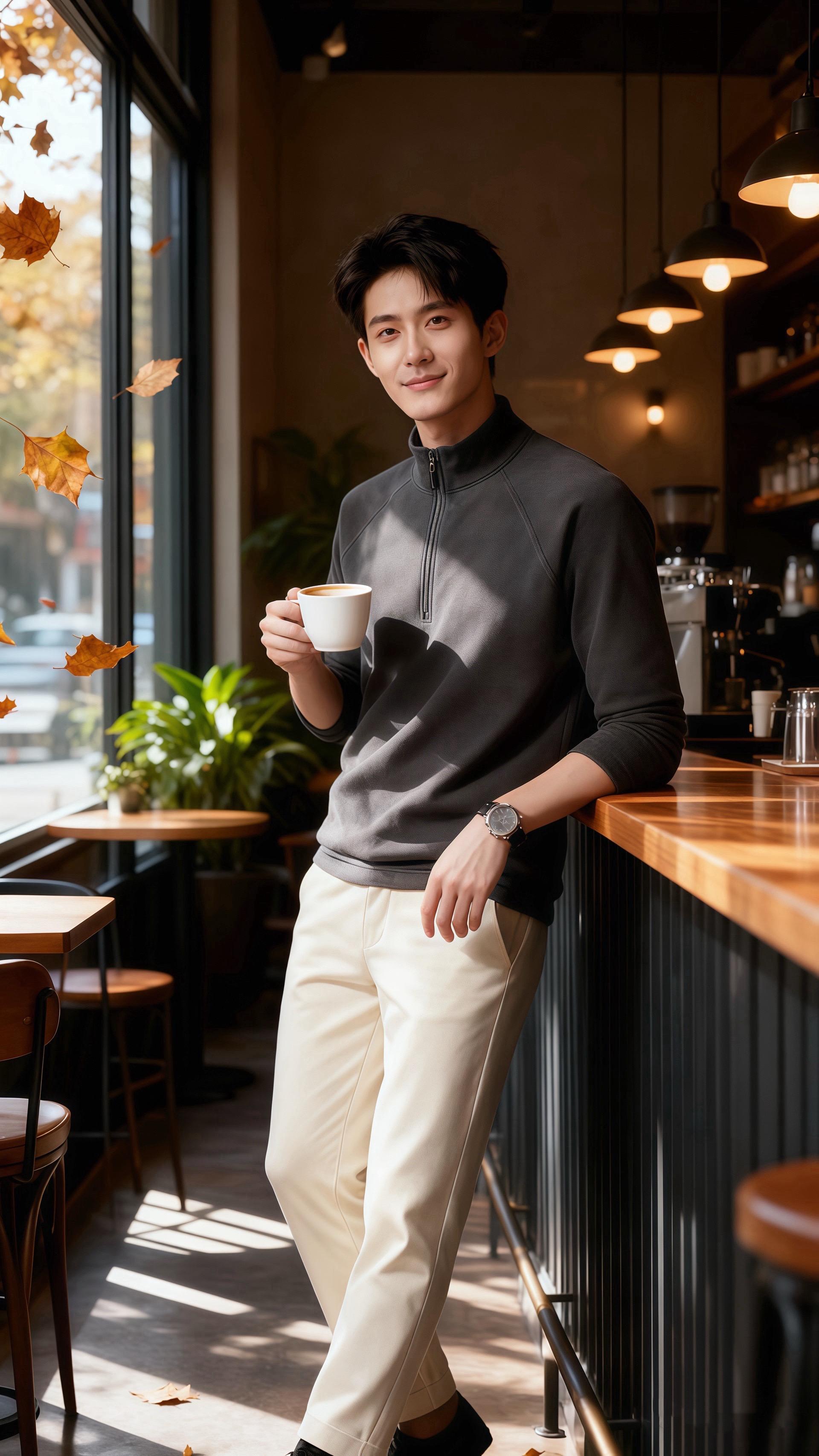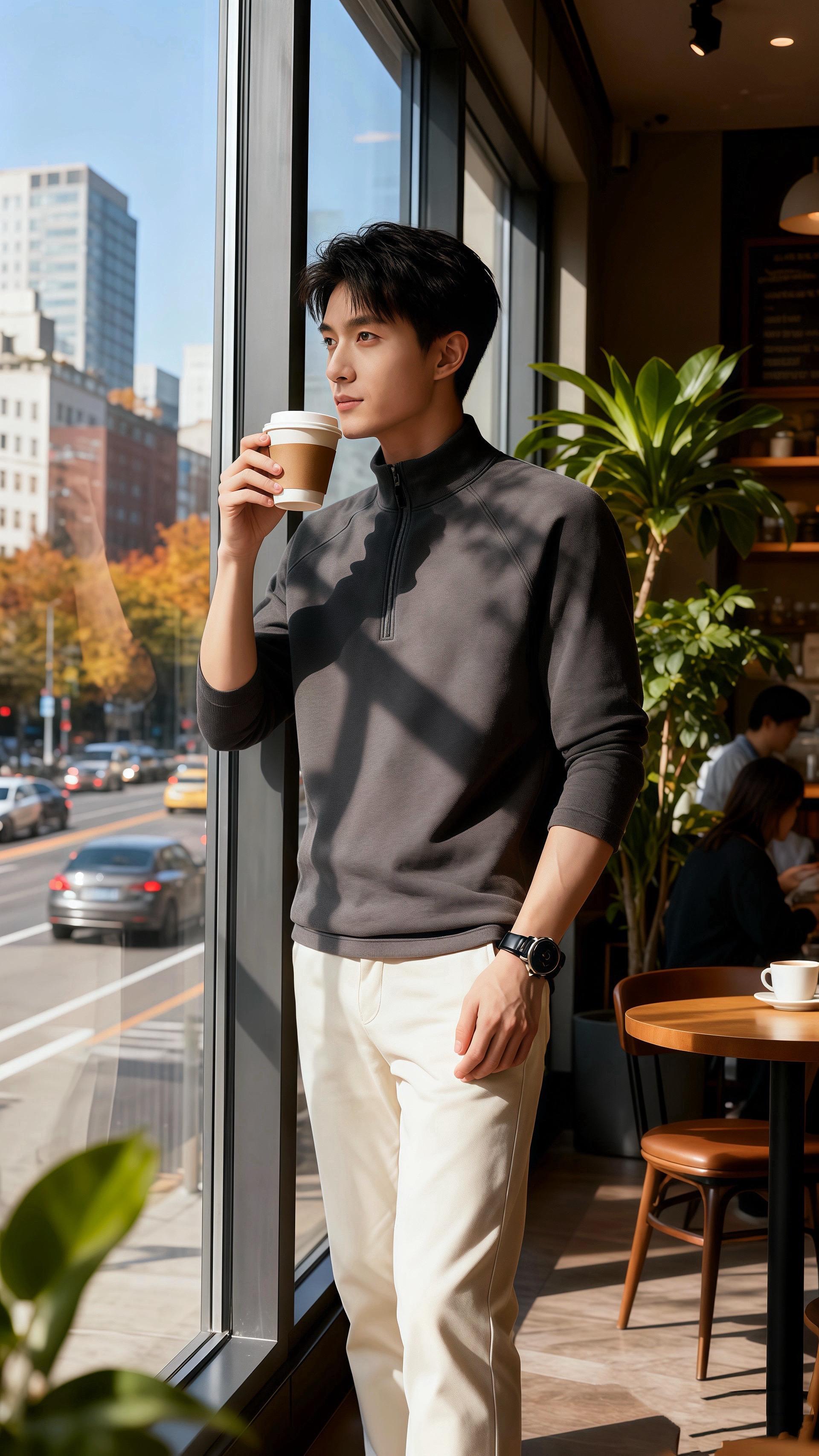 窗外的车流碾过落叶,他端起咖啡,衫角蹭过杯沿,暖得像刚烘好的底气。原来