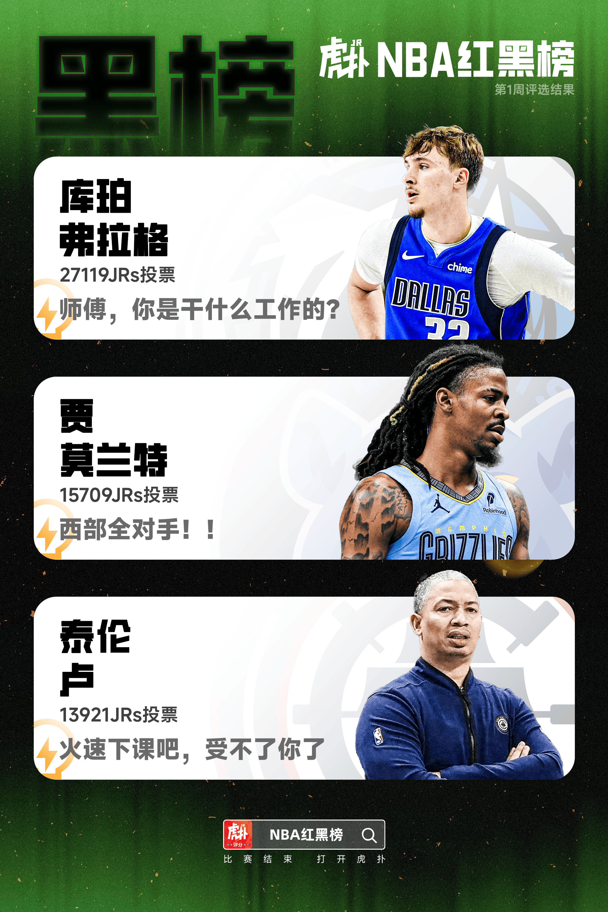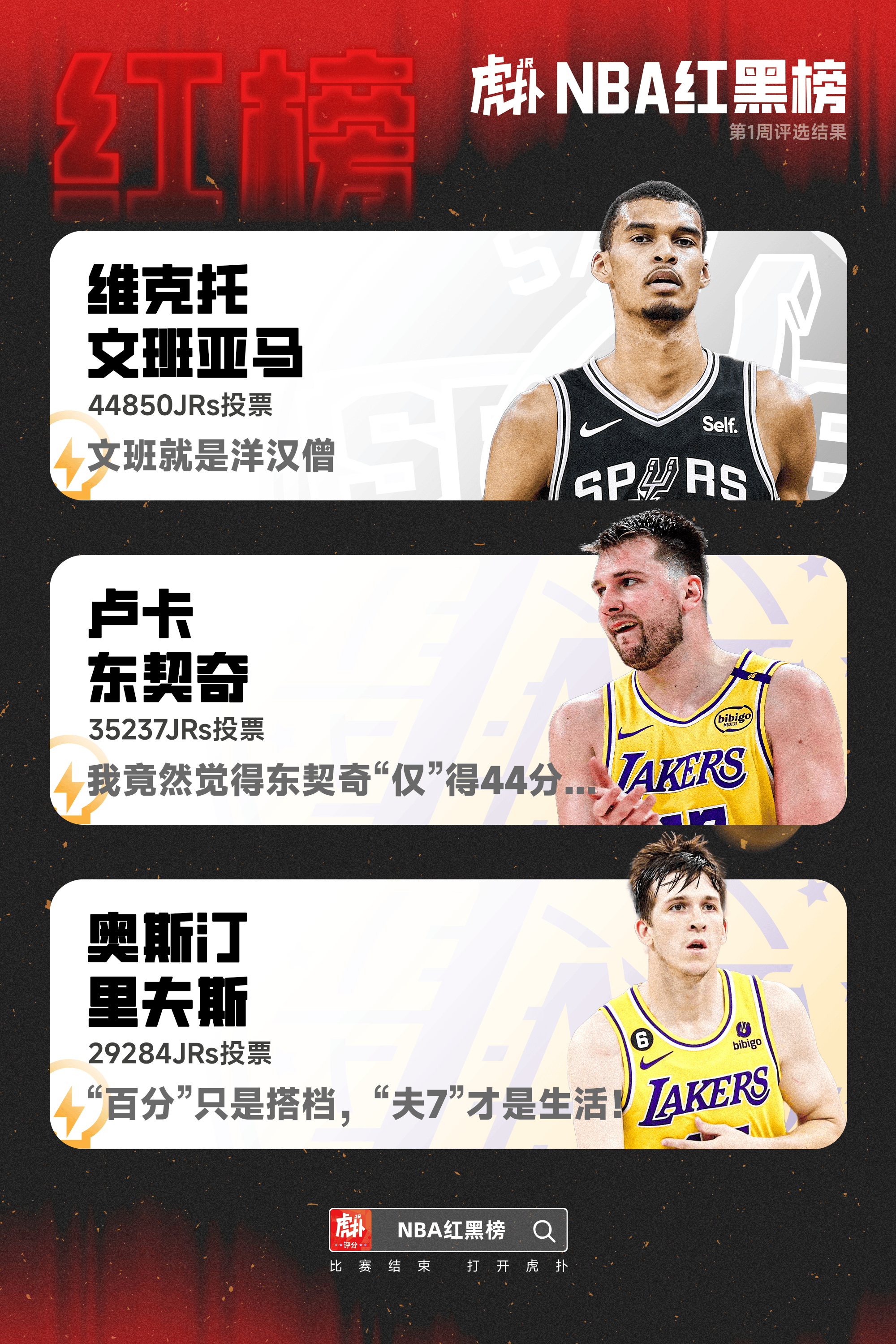 第一周NBA常规赛结束,虎扑为各位JR带来本赛季的评选活动:NBA红黑榜评选,我们邀请JRs依据本周球员和教练们的表现,理性客观的评选出三位红榜人选,三位黑榜人选。