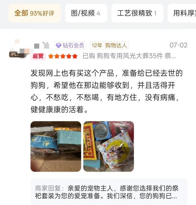 而点开另一家购物平台,大皖新闻记者看到,同样有各种宠物冥币纸品,价格在几元到一百多元不等,套装较多,多家店铺销量破千。而在评论区,还有不少消费者给了好评,并晒出购买的冥币。多名消费者留言均提到,是希望让爱宠在另一个世界也能丰衣足食,生活得更好。