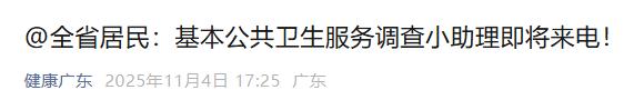11月4日,据广东省卫生健康委消息,广东省基本公共卫生服务项目管理办公室即将在全省范围内启动2025年智能语音调查,了解掌握广东省常住居民对基本公共卫生服务项目的知晓率与满意度情况,以便为进一步提高广东省基本公共卫生服务质量、可及性、公平性等提供依据。