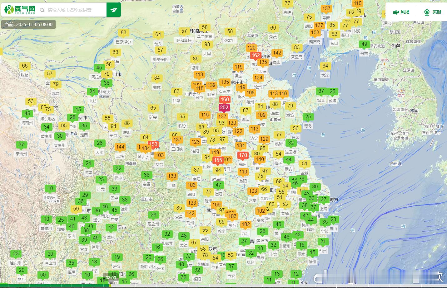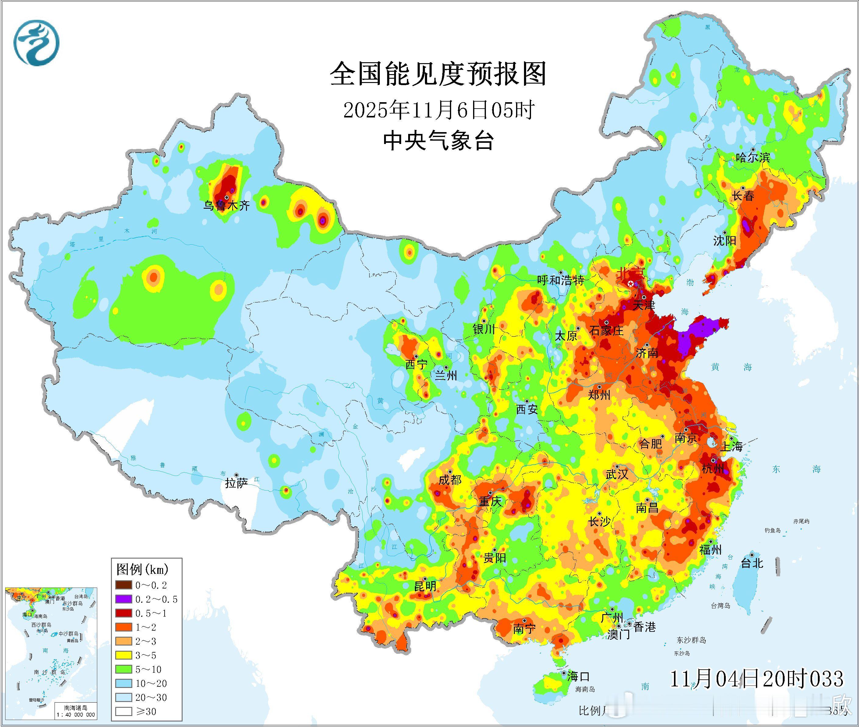 【雾和霾】今晨在北京、天津、河北、山东、江苏、安徽、河南、陕西、湖北、湖南、贵州、四川部分地区出现大雾,个别站点能见度不足100米:北京佛爷顶、天津北辰、武清、陕西华山、湖北南漳、长阳、湖南花垣、涟源、安徽青阳。另外从空气质量看,东北华北黄淮一带存在污染,对应还有霾。