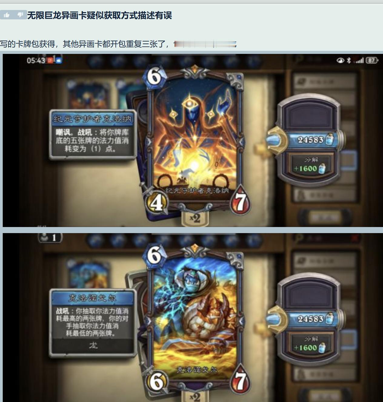 炉石传说 无限巨龙异画卡获取有BUG,写的卡牌包获得,但是不少佬哥其他异画卡都开包重复三张了,也没开到无限巨龙。富哥们注意一下[允悲]