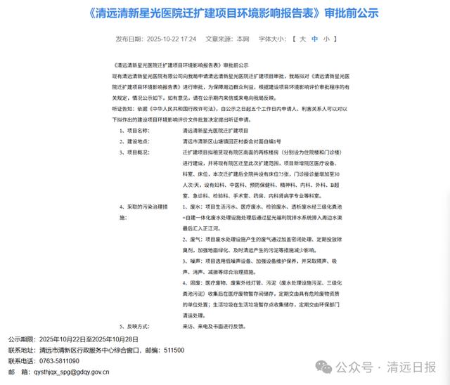 公示显示,该项目建设地址为清远市清新区山塘镇回正村委会对面自编1号,迁扩建项目拟租赁现有院区南面的两栋楼房(分别设为住院楼和门诊楼)进行建设,并将现有院区迁至此次扩建范围,项目新增院区医疗设备、科室、床位,本次迁扩建后全院共设有床位75张,门诊接诊量增加至30人次/天,设有妇科、中医科、预防保健科、精神科、内科、外科、B超室、急诊科、检验科、手术室、药房、内科肾病学专业等科室。