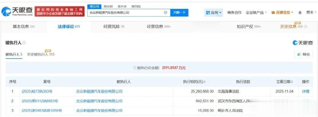 天眼查法律诉讼信息显示,11月4日,哪吒汽车关联公司合众新能源汽车股份有限公司新增一则被执行人信息,执行标的2526万余元,执行法院为北海海事法院。