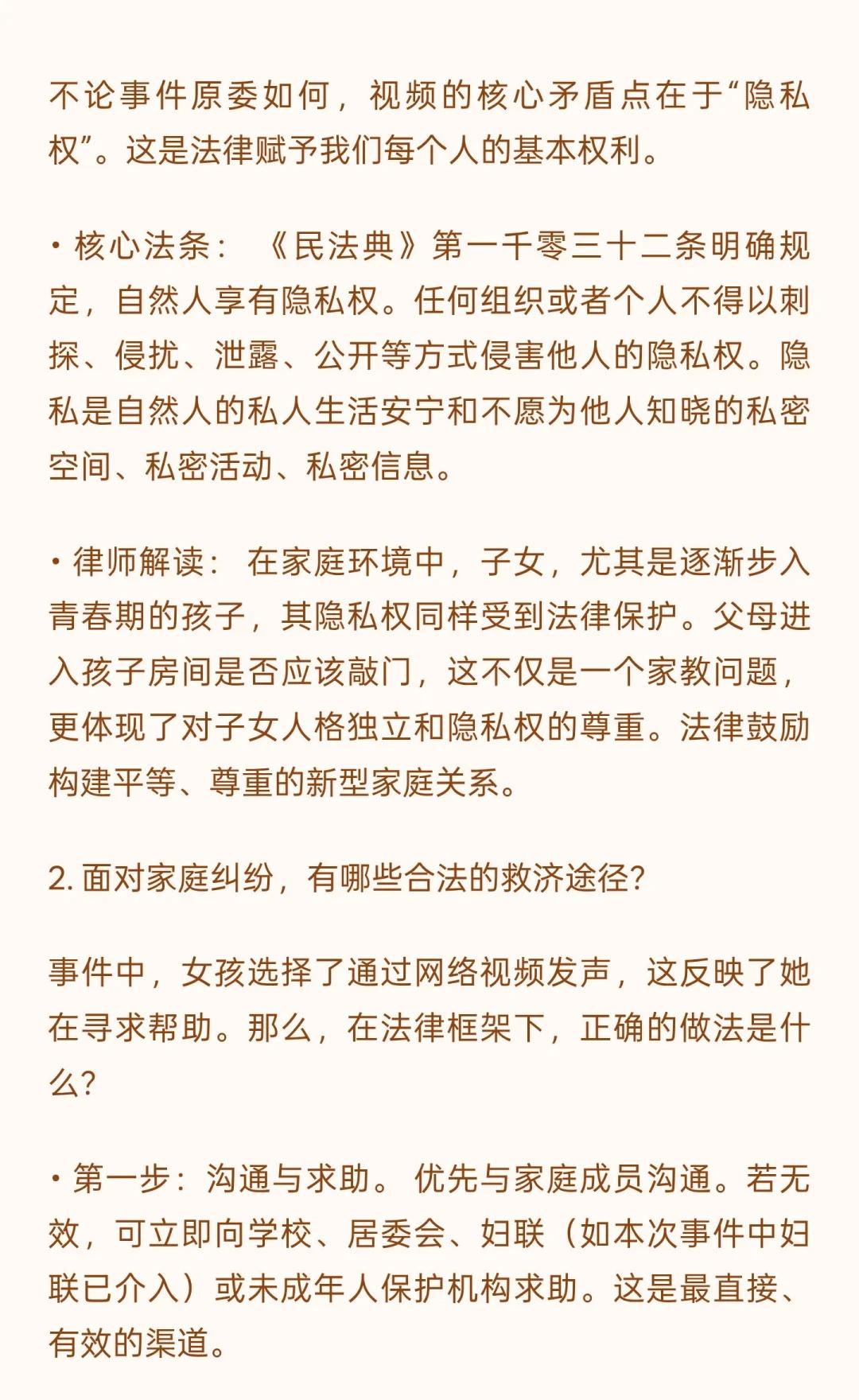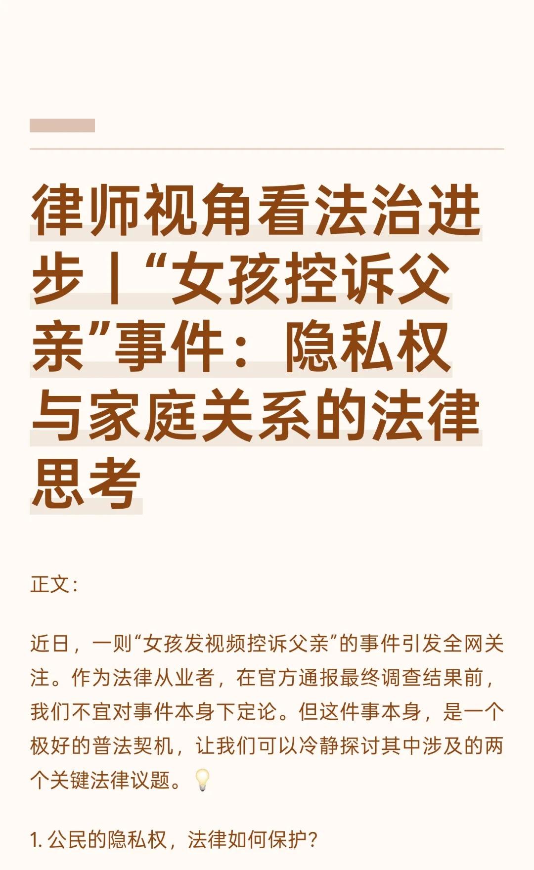 律师视角看法治进步|“女孩控诉父亲”事件 女孩控诉父亲事件引发隐私权与家庭纠纷讨论。隐私权受法律保护,家庭纠纷可通过沟通、求助、报警或诉讼解决。理性看待网络信息,重视家庭法治教育,及时寻求官方帮助,是保护自身和家人的重要途径。长沙律师