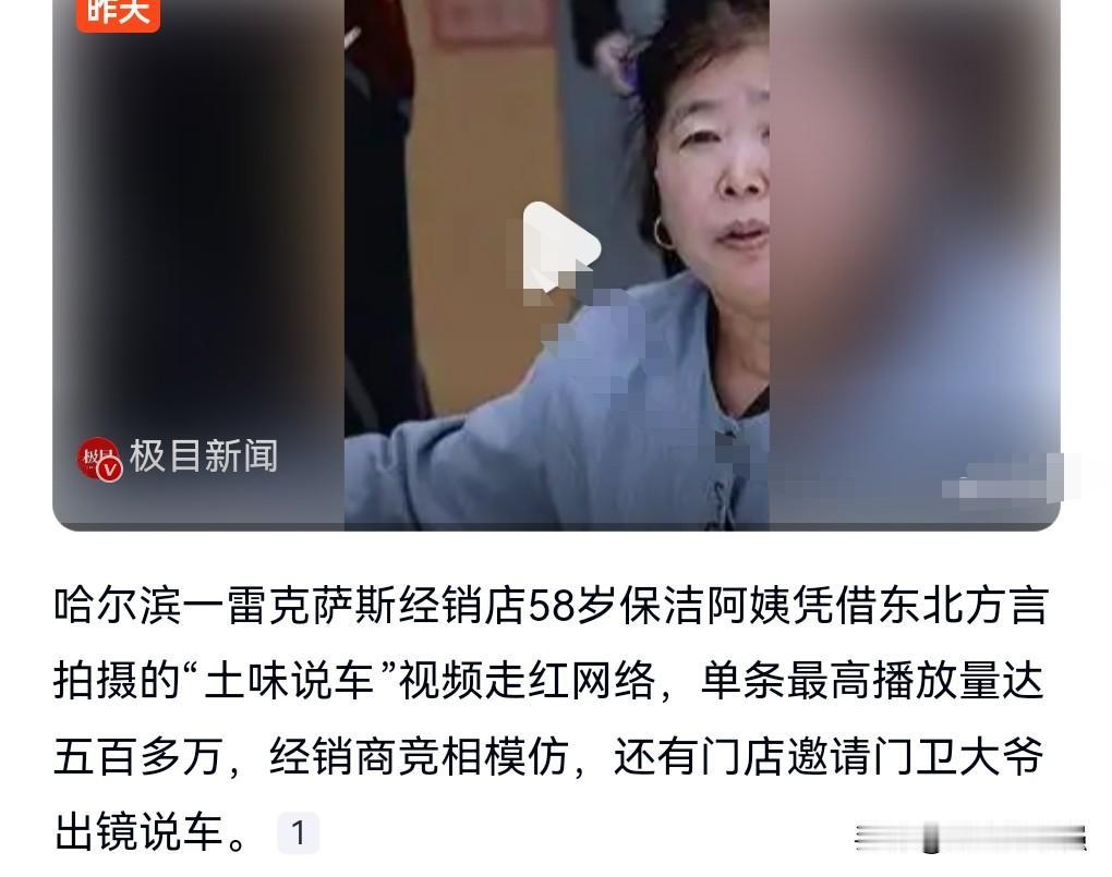 这年头讲究的就是一个反差感,就像以前的大衣哥一样,穿着普通的大衣,拥有好嗓子一炮而红。 近日,保洁阿姨拍“土味说车”视频出圈,大家就喜欢看这种反差感的视频,让人觉得有意思。 很多车商竞相模仿,有的已经开始找门卫大爷出镜说车了。 之所以会出圈,那是因为这个赛道刚开始的时候竞争者很少,如果人多了都来模仿,那这条路也会走不通的。
