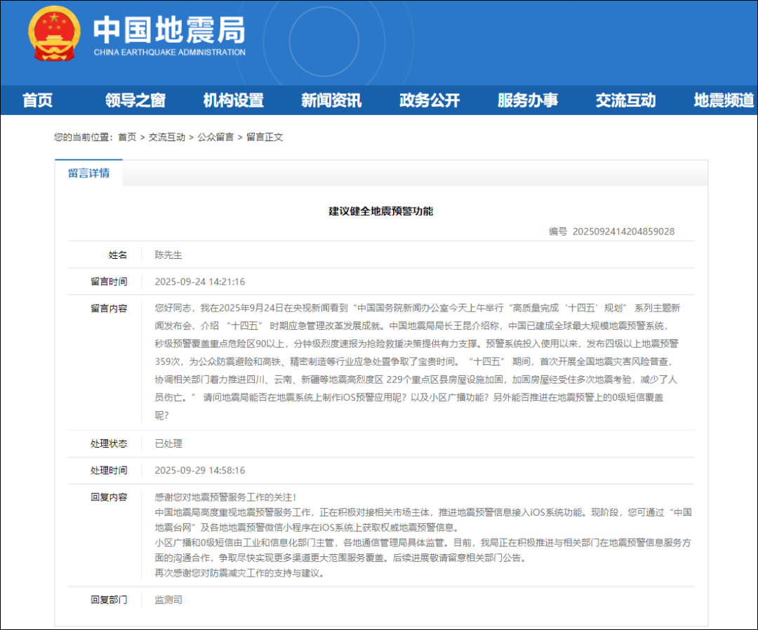 10月,有公众留言向中国地震局询问:“请问地震局能否在地震系统上制作iOS预警应用呢?以及小区广播功能?另外能否推进在地震预警上的0级短信覆盖呢?”