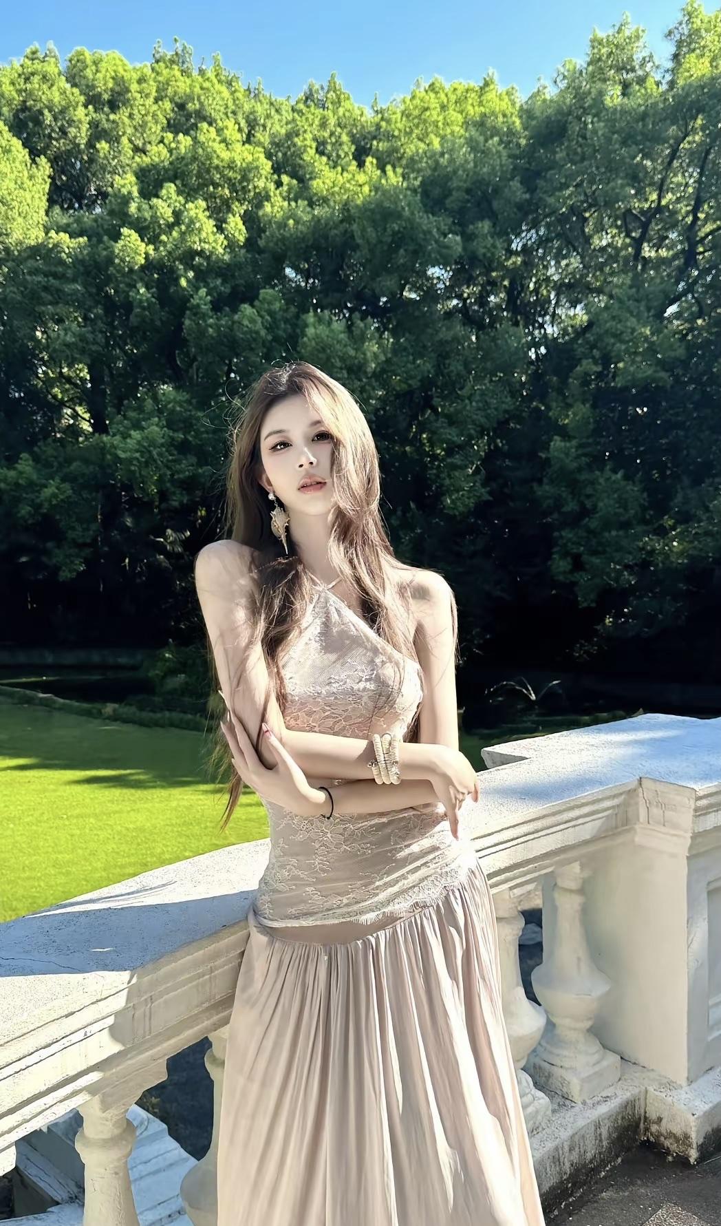 优雅绿意中,她如梦似幻,轻纱裙摆随风飘逸。