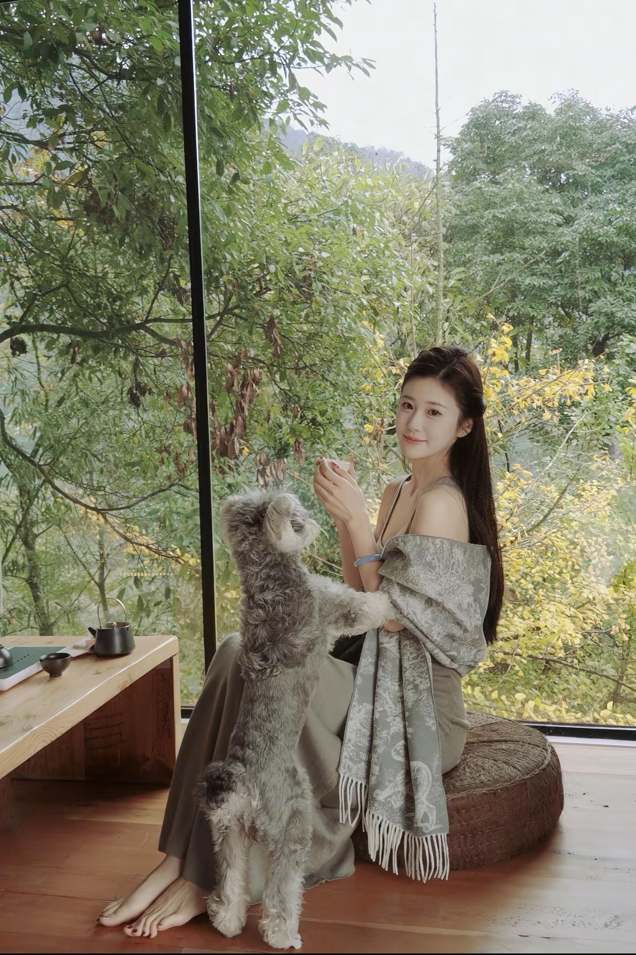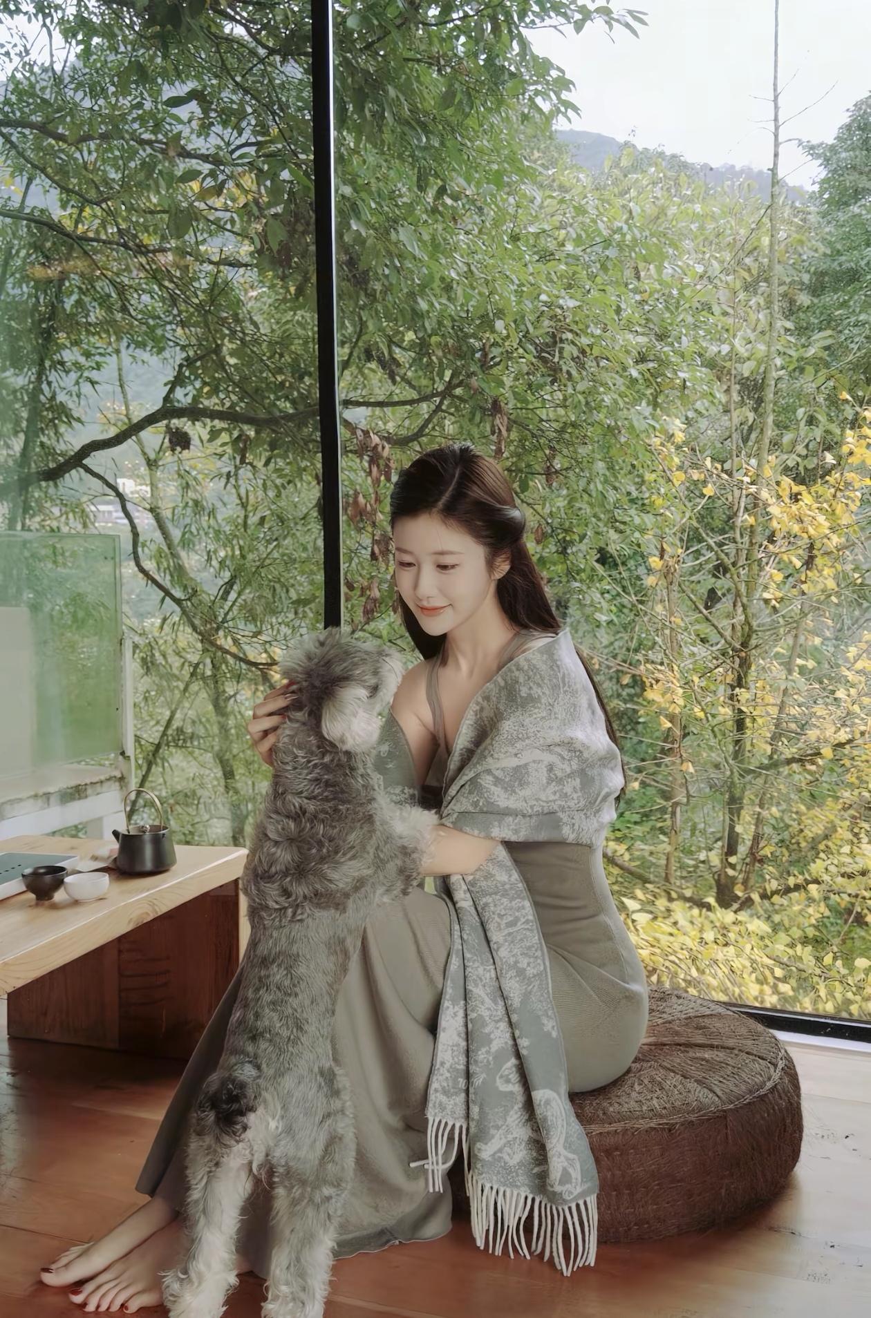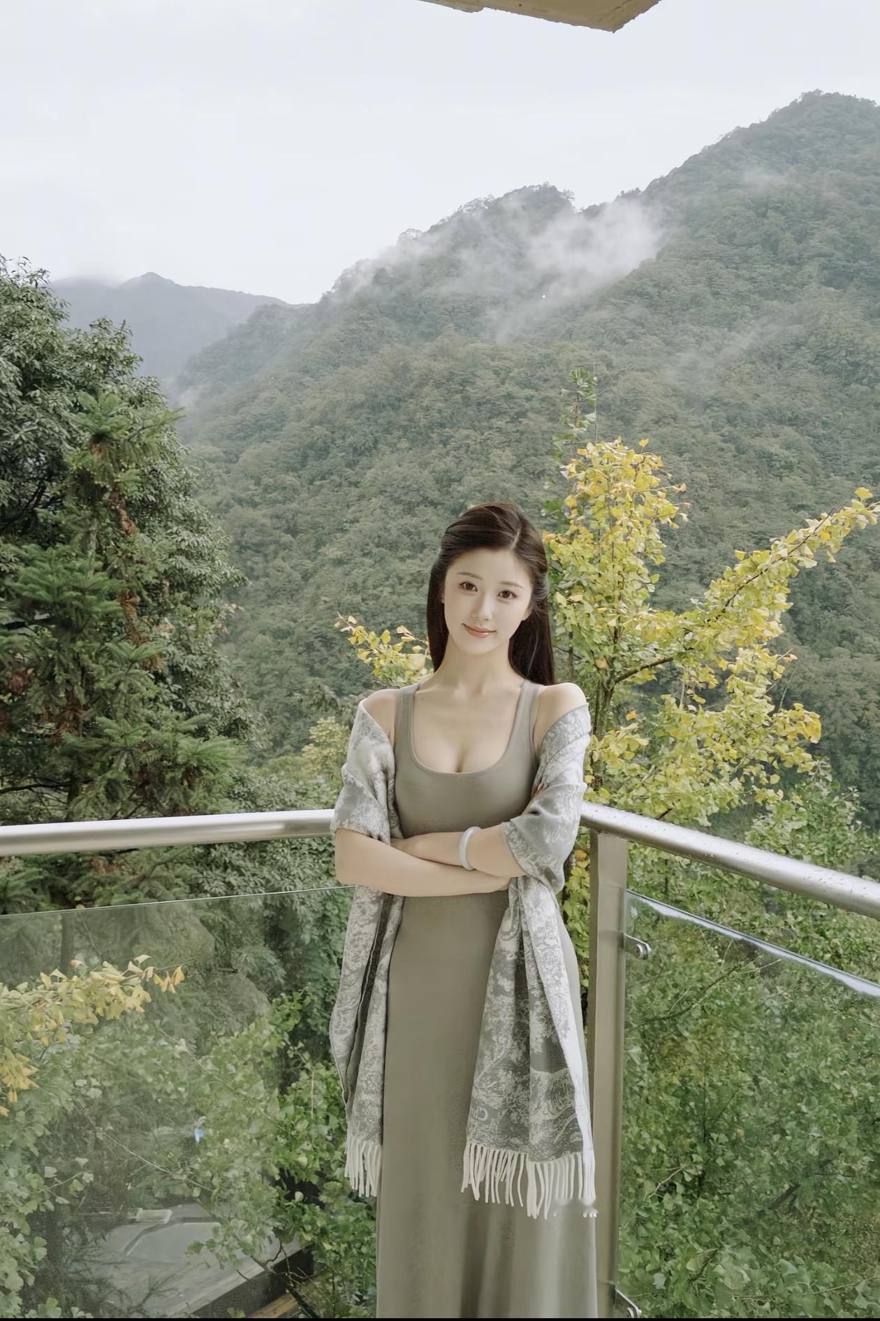 云雾缭绕的山间仙境,优雅女子倚窗而立,尽显自然之美。