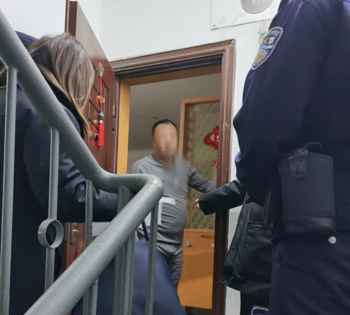 团团围在门口后,干警上前敲门表明身份,一男子开门口神色慌张。