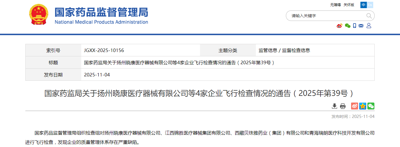国家药品监督管理局组织检查组对扬州晓康医疗器械有限公司、江西锦胜医疗器械集团有限公司、西藏贝珠雅药业(集团)有限公司和青海瑞朗医疗科技开发有限公司进行飞行检查,发现企业的质量管理体系存在严重缺陷。