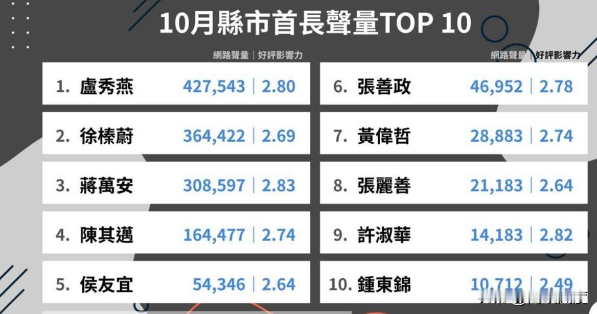 台湾《网络温度计DailyView》10月份县市长声量出炉,卢秀燕因“非洲猪瘟”被打成“猪头”,声量和好感度让人惊讶! 透过舆情分析软件《KEYPO大数据关键引擎》,《网络温度计DailyView》盘点10月十大县市首长声量排行榜,就声量部分,卢秀燕位列第一,主要原因是台中爆发非洲猪瘟疫情,引起全台高度关注,民进党当局“府院党”加侧翼把卢秀燕往死里打,使其网络声量也随之提升。 声量第二位是徐榛蔚,主要是由马太鞍堰塞湖溃堤引发舆论高度关注,民进党阴谋利用灾情释放出有杀伤的消息来打击傅昆萁、徐榛蔚以及花莲县政府,讯息曝光引发舆论哗然。 声量第三位的是蒋万安。蒋万安的施政成绩已超越历任台北市长,且以年轻活力的形象成为台北最佳的代言人。尤其是英伟达海外总部落地台北的前期工作经过斗智斗勇后基本尘埃落定,这都让蒋万安声量迅速上升。 但如果从好感度上来看,蒋以2.83赢得第一,许淑华以2.82赢得第二,卢秀燕以2.80获得得三。 对于卢秀燕排在第三,有点让人惊讶。不过这也说明台中经过非洲猪瘟一役,虽对卢秀燕的形象有所损伤,但从好感影响力来看,并没有显著降低,而且名列前三甲。 虽然民进党全方位无死角的挞伐台中卢秀燕团队,但民众一直质疑,病毒株并非来自本土,虽在台中爆发,但病毒一定是从口境流进,不可能从台中所谓厨余中凭空出现。因此民进党当局一再检讨卢秀燕时,却对执政当局的边境管理之疏失闭口不提,这种甩锅大戏也让民众反感。 如果不出意外,随着台湾猪瘟告一段落,卢秀燕的声量和好感影响力会快速回升。郑丽文、卢秀燕、蒋万安如结成铁三角,必将对民进党形成沉重压力!