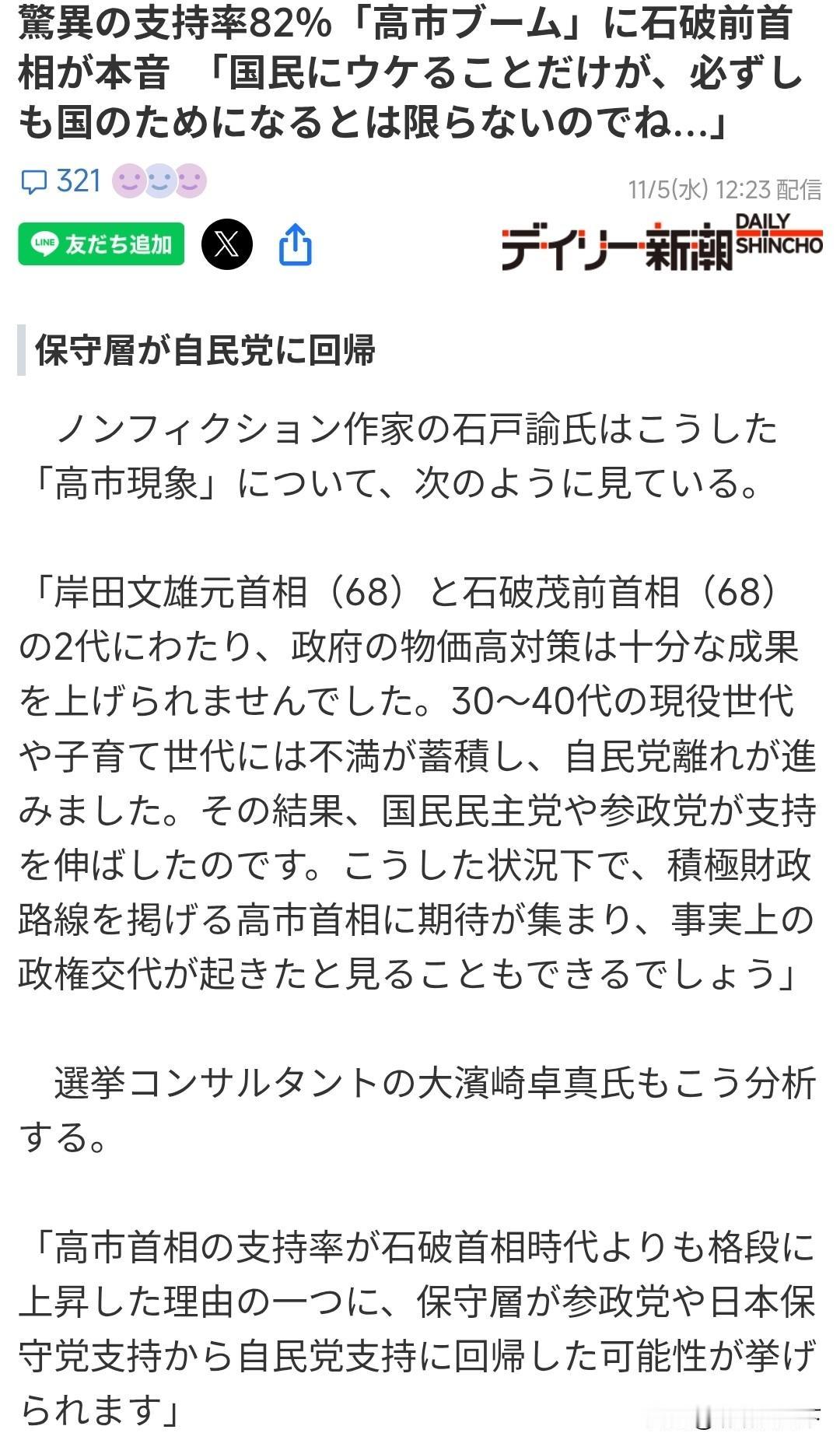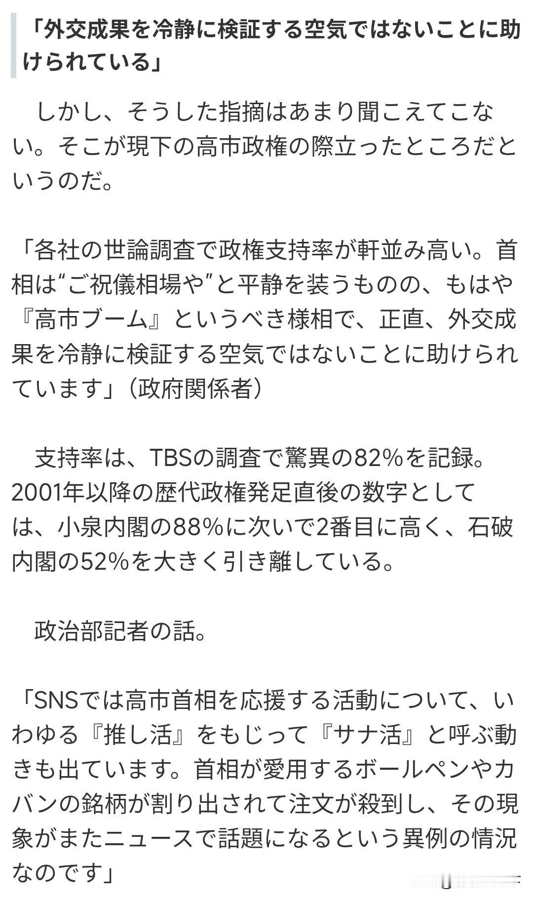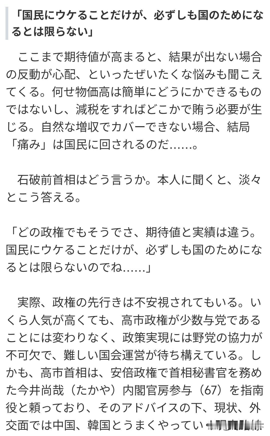 高市早苗作为极右翼政客, 在成为日本首相后, 得到了日本政坛历史上第二的高支持率80%,仅次于2001年的小泉纯一郎组阁初始时的88%。 日本狂热支持者对她的各种溢美之词不绝于耳,对她个人喜欢的物品也是赞美有加。 她在APEC期间的各种言行举动遭到批评,在与我们会谈中的表现也是乏善可陈,但是并没有影响到支持率。 为啥? 有日本政府相关人士说,因为在日本,没有冷静评估外交成果的气氛。 而且前两任首相,岸田和石破在应对超高物价时没有成效,联合执政的右翼政党日本维新会的支持者期待她会带来变化。 这些高期待促使她的支持率令人惊异的高。 但是她真能兑现承诺吗? 媒体承认,物价高不是那么容易就解决的,减税的话肯定也要找到合适的财源才能应对,她是少数席位执政党的现状也没有改变,外交上能不能与中国和韩国和平共处也充满变数...... 有人问前首相石破,他(淡淡地)说: “哪个证券都一样,期待与实绩事与愿违。有人气也不一定就一定对国家有好处! ” Just wait and see!