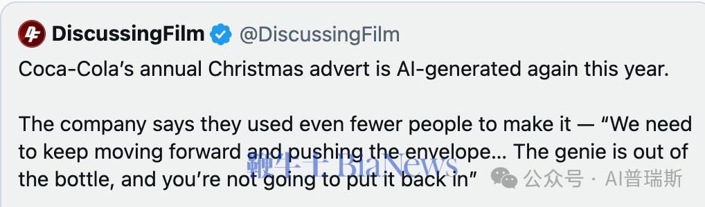 可口可乐这一波AI营销,像是在验证一个尴尬真相:技术的进步,不等于情感的进化。用算法取代人心的广告,再逼真也难以打动人。(转载自:AI普瑞斯)