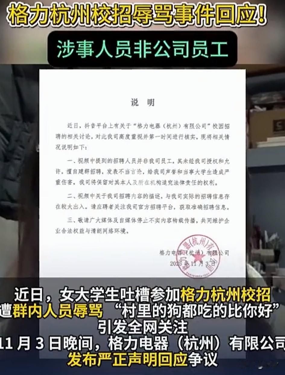 杭州某力公司校园招聘辱骂大学女生, 人家就问了劳动强度和薪资待遇, 就被赤裸裸的辱骂, 招聘人员自己不是曾经的大学生吗, 如果是的话那就是数典忘祖, 看不起曾经的自己, 如果不是那就更恶心了, 自己考不上将自卑转换愤怒, 这就是无能的表现, 靠运气混到今天, 是早晚要倒霉的, 出事后不是应该迅速何时给女生道歉吗?为什么非要当年给人家道歉, 即使人家没有发送学校定位, 还是被锁定了, 要求人家删除不当言论和视频, 到底是谁不放言论, 真的让人无语了, 这就是国内企业如今的担当吗? 自己都不尊重知识和人才, 就不要管墙倒众人推了, 失去了国内百姓的认可, 结局已经注定了, 友商估计开心坏了! 大家对于这次校园招聘事件怎么看? 杭州爆料 格力电器 职场侮辱 杭州应届生求职 杭州职场事件