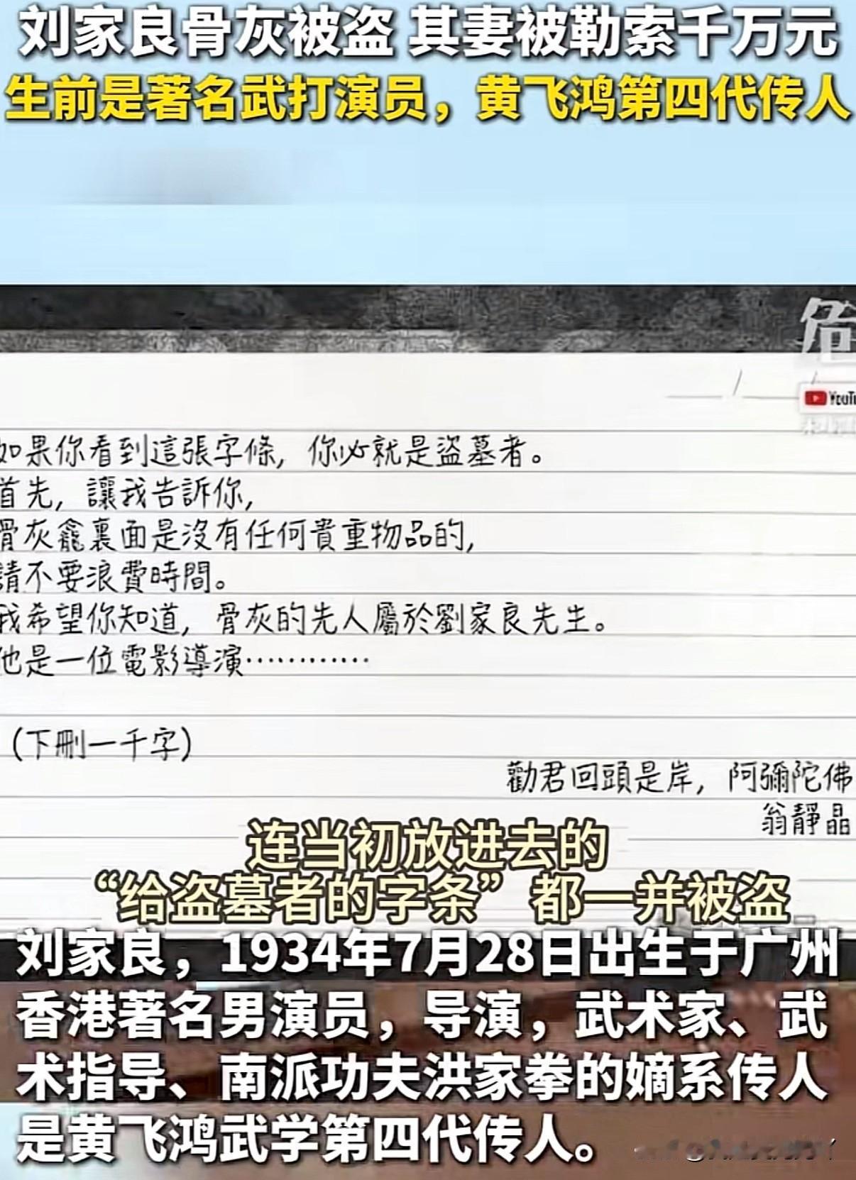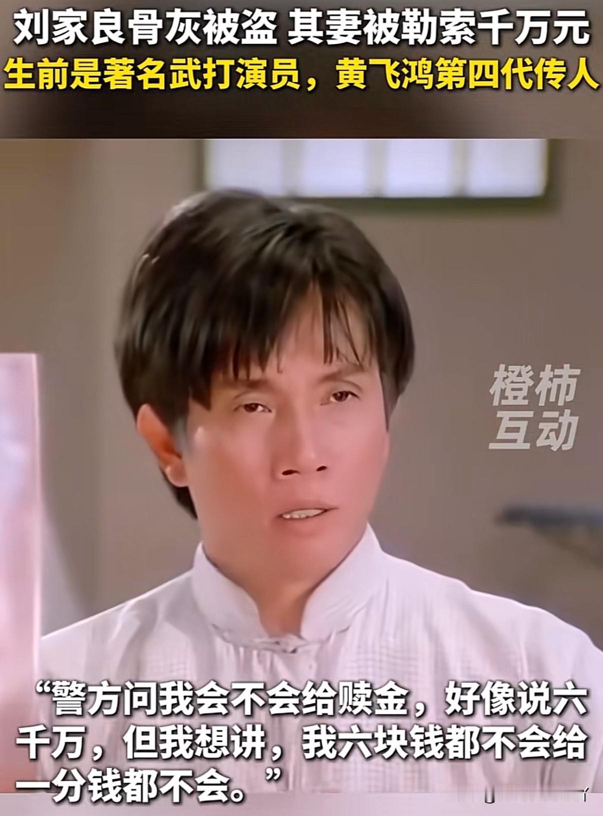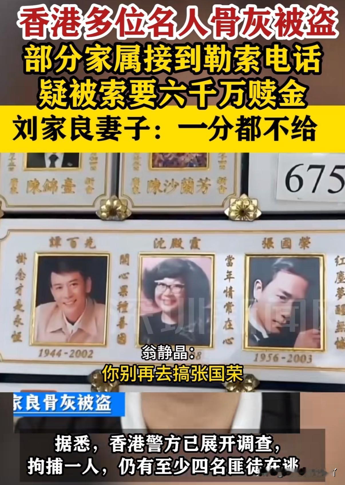 太缺德!偷骨灰勒索家属6000万赎金 11月3号香港演员翁静晶表示接到墓园工作人员电话称亡夫刘家良骨灰被盗,同时被盗的还有多位名人骨灰 刘家良1934年出生于广东,黄飞鸿武学嫡系第四代传人,兼演员、导演、武术指导,2013年因淋巴癌去世,安葬于香港宝福山。刘德华为其题写“一代宗师”陈百祥担任丧礼主事人 警方核实刘家良墓地仅剩两块布和一本纪念册,连当初下葬时写给盗墓者的字条都被偷走,翁静晶表示不要说6000万6块钱她都不会付,不会助长这种歪风邪气。对于是否还能找回骨灰她也表示不抱希望 目前警方已经抓捕一名嫌犯,但仍然有至少4人在逃。 宝福山墓园埋葬多位名人,其中包括张国荣、沈殿霞等,刘家良妻子也向盗墓者喊话“别去动张国荣”。 确实如果这次给了赎金那以后墓地埋的那些名人骨灰都会有被盗风险