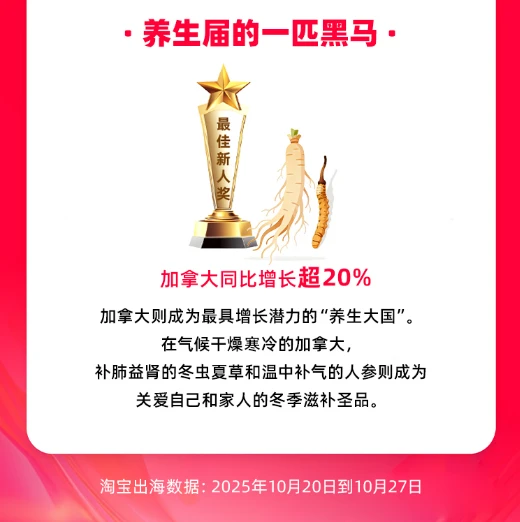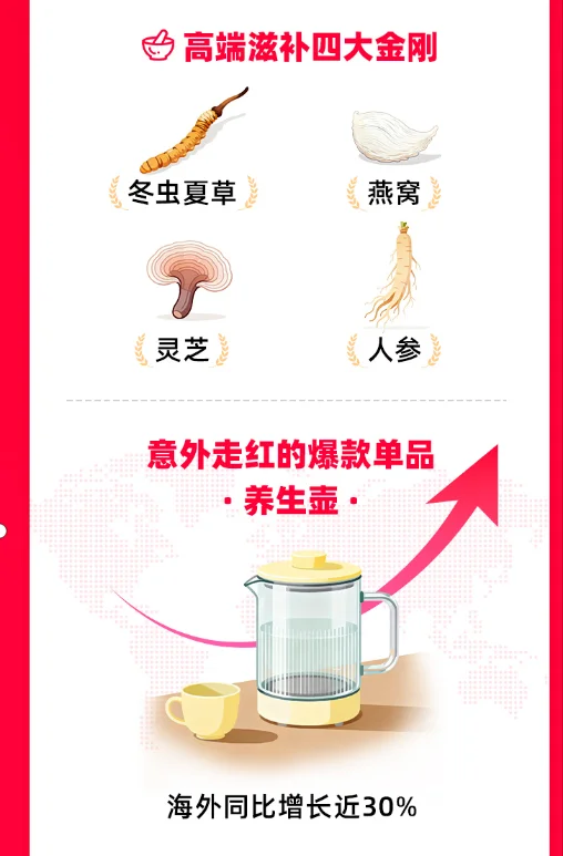 大家好,我是淘宝店主薇薇,现在正是我们电商人一年最忙碌的双十一期,除了忙自己的店铺外,我一直还在关注电商实时新闻和销售数据、榜单等, 经常有很多朋友跟我说不知道能卖什么产品,特别纠结选品这件事,我建议各位就可以在这种大促节点关注一下新闻,因为它们的数据反应的正是市场当下最准的需求和方向, 今年双十一就有个词在海外市场火出圈了,这个词是“中式养生” 提到这个词你能想到什么,对,就是“祛湿”“暖宫”“健脾”“补肾”和“黑发”这种“老式”养生的词,这些原本是只有中国人爱干的事,没想到在今年竟然也火到国外去了, 根据发布的数据,今年双十一首周淘宝健康消费全行业海外成交实现双位数增长,而我刚刚提到的5个养生词就是外国人搜索最高的5个养生关键词, 这些需求对应的产品是: ✅广式清补凉煲汤料 ✅宁夏枸杞 ✅各类养生茶 ✅黑芝麻丸 ✅阿胶制品 这些产品是今年双十一淘宝海外销量最高的“养生五件套”, 与此同时,养生壶这个品也被它们带火了,今年养生壶的海外成交额同比增长近30%, Ins上有一个话题标签叫“goji berry”,指的是“枸杞”,现在很多外国人会把枸杞加在麦片、酸奶里(见图2),而枸杞、人参这种中国人熟悉的传统保健食品现在也成为了国外的网红食物, 当下健康消费在全球是个百亿美金规模且高速增长的行业,里面有很多类目值得我们关注,比如占比将近7成的营养保健品,还有非处方药、家用医疗器械、隐形眼镜、成人用品等,这些品类都有巨大的增长空间, 作为普通卖家,如果也想在跨境的养生赛道分一杯羹,我个人认为是可以考虑淘宝的出海项目的,因为相比于亚马逊等其它跨境电商模式,淘宝出海这个模式可以让卖家以最低成本入场,无需重新开店,直接在淘宝就能把货卖到全球,及时享受跨境电商红利, 建议有想法的朋友可以试试看!