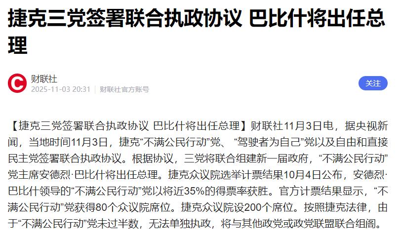 乌克兰战败的后果提前出现。反乌克兰的右翼政党在捷克共和国大选中获胜,不是一个,是三个,他们全都批评对乌克兰的支持。 当地时间10月4日,捷克统计局公布众议院选举最终计票结果,安德烈·巴比什领导的"不满公民行动党"以近35%的得票率领衔胜出,这一结果让支持对乌援助的传统执政党陷入被动。 仅仅一个月后的11月3日,"不满公民行动党"便与"驾驶者为自己"党、自由和直接民主党正式签署联合执政协议,三个反对援乌的政党敲定共同组建新一届政府,巴比什将出任总理。 据捷克总统府发布的联合声明显示,新政府组建后首要议题之一便是重新评估对乌援助政策,这与此前执政联盟的立场形成鲜明对比。这场政治变局并非偶然,实则是俄乌冲突持续发酵下欧洲政治生态变化的缩影。 自冲突爆发以来,欧洲国家因能源价格飙升、通胀高企等问题承受着巨大民生压力,民众对持续援乌的质疑声浪不断高涨。这种情绪已逐渐转化为政治力量,让不少国家的执政党在政策推行上举步维艰。 就以捷克为例,此前政府承诺的对乌军事和经济援助计划,因国内财政紧张和民众反对声,多次遭遇议会阻挠。毕竟连国内的经济问题都不见好转,还要举债援助其他国家,任谁都会不满这样的政府。 类似的趋势在欧洲其他国家也已有显现,匈牙利总理欧尔班长期秉持对乌援助谨慎态度,其政党在国内选举中多次稳固执政地位;斯洛伐克上月举行的议会选举中,反对继续援乌的政党同样取得优势。 这些案例都印证了,对乌政策已成为影响欧洲多国选举走向的关键变量。捷克此次的政治更迭,更像是这种趋势的集中爆发,它标志着欧洲对乌援助的政治共识正在逐渐松动。 对于新组建的捷克联合政府而言,如何在维护欧洲团结与回应国内民意之间找到平衡,将是其面临的重要挑战。 而从更广泛的欧洲层面来看,捷克的变局或许只是一个开始,若俄乌冲突持续,未来可能会有更多国家的政治格局因援乌议题发生调整,这无疑将对欧洲的对乌政策走向产生深远影响。