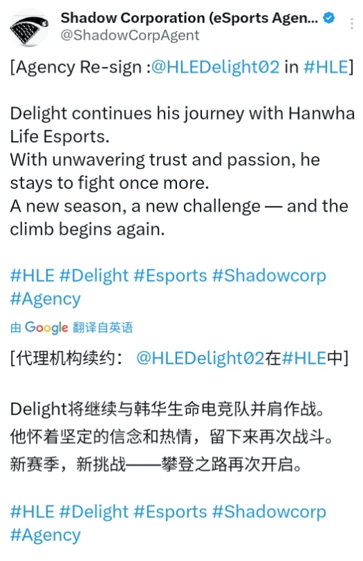Delight将与HLE并肩作战。他怀着坚定的信念和热情,留下了再次战斗。新赛季,新挑战——攀登之路再次开启。