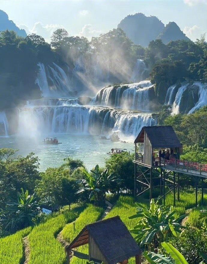 这样的广西,你可曾见过? 不是滤镜,是无人机实拍:德天瀑布跨国水帘一秒切换中越模式,水雾+彩虹=天然柔光箱;靖西通灵大峡谷2800米地下暗河+188米单级落差瀑布,被称“现实版盗墓笔记”;龙脊梯田灌水季镜面千层,日照直接把云扔进田里。旅游