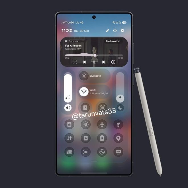 OneUI8.5的新设计支持用户将最常用的功能,如手电筒、数据开关、屏幕录制等,全部集中到面板的右下角或拇指最容易触及的区域。此外,音量和亮度滑块也可以调整为更紧凑的垂直样式,进一步为常用开关腾出宝贵的黄金位置。