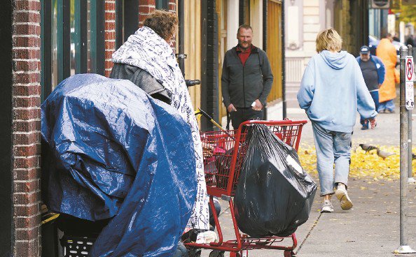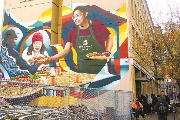 在俄勒冈州波特兰,等待领取免费食物的人们排起长队
