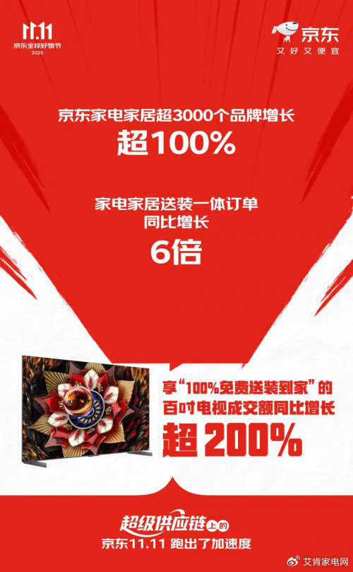 苏宁易购数据显示,国庆期间其旗下SuningMax全国门店销售额同比增长61%,万元以上高端家电销售额同比增幅达73%;淘宝天猫平台“双11”开卖首小时,即有80个品牌成交额突破亿元,家电家装家居领域焕新消费热潮凸显,品质化、健康化、智能化趋势进一步强化;10月30日晚8点京东11.11“百亿补贴日”开启后,24小时内京东家电家居“闪电新品”成交额同比增长150%,家电家居送装一体订单量同比增长6倍,百英寸及以上电视销售额同比增长200%,全面印证高端化、场景化消费需求的爆发。