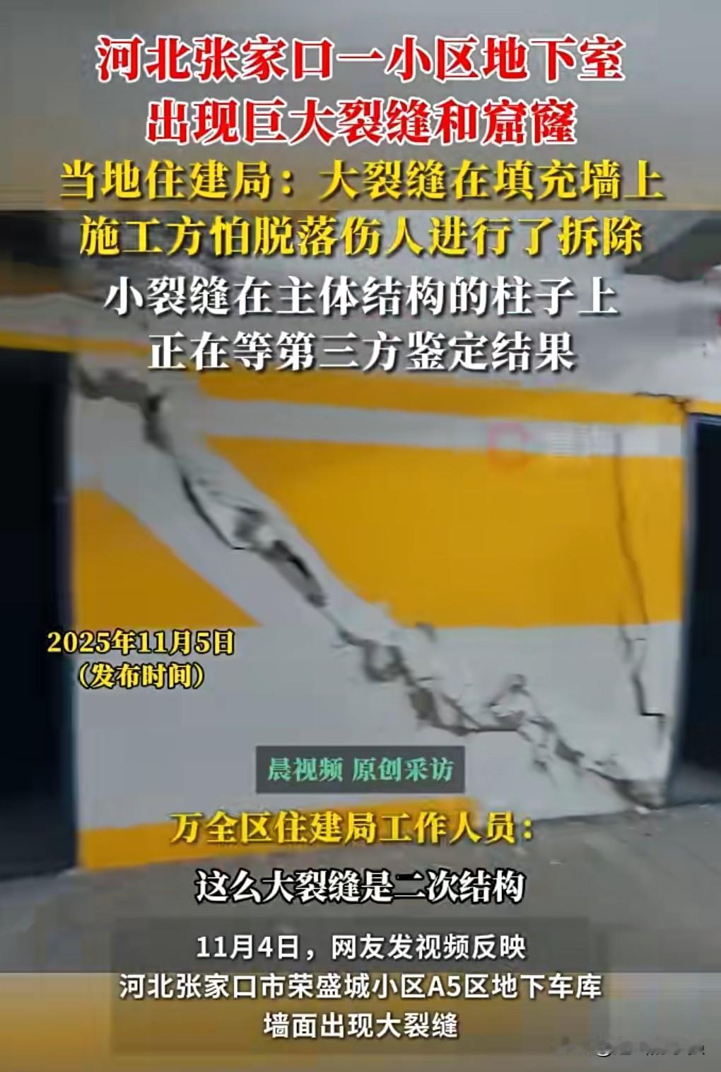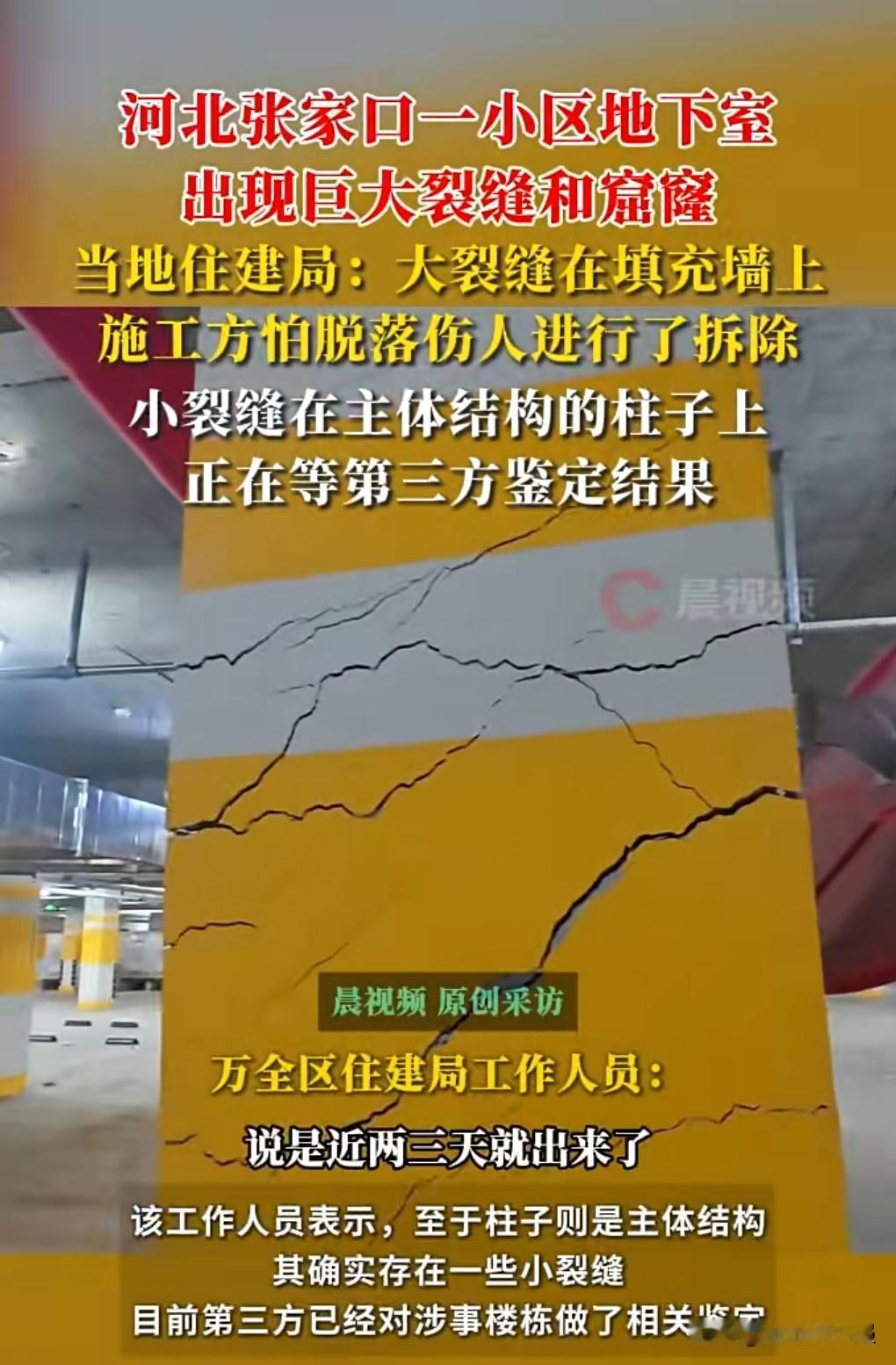 这真的是太吓人了,让人住着都不安心啊。 这到底是什么原因引起的?为什么会出现这么大的质量问题? 11月4日有网友发视频反映,河北一小区地下室现巨大裂缝和大洞。 这样的情况,反正我是不敢住的。 一定要查出原因,要追责才行。 买到这样的房子,简直是太闹心了。
