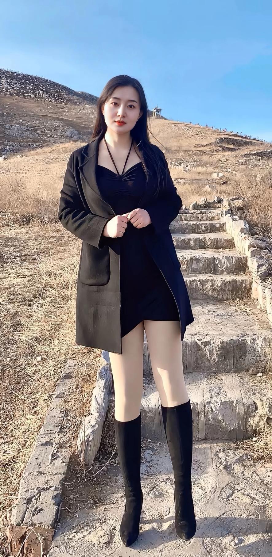 这姑娘穿着酷酷的,站在台阶上。