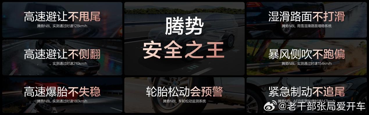 主动安全方面,得益于易三方,诸如128km/h高速避让不甩尾、210km/h高速避让(鱼钩测试)不侧翻、180km/h高速爆胎不失稳、154km/h暴风侧吹不跑偏、147km/h AEB自动紧急制动等腾势N9的复杂技能,腾势N8L也具备。这也将是腾势N8L区别于同级对手的优势所在。