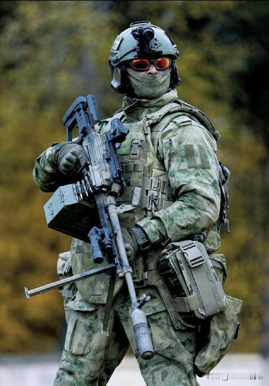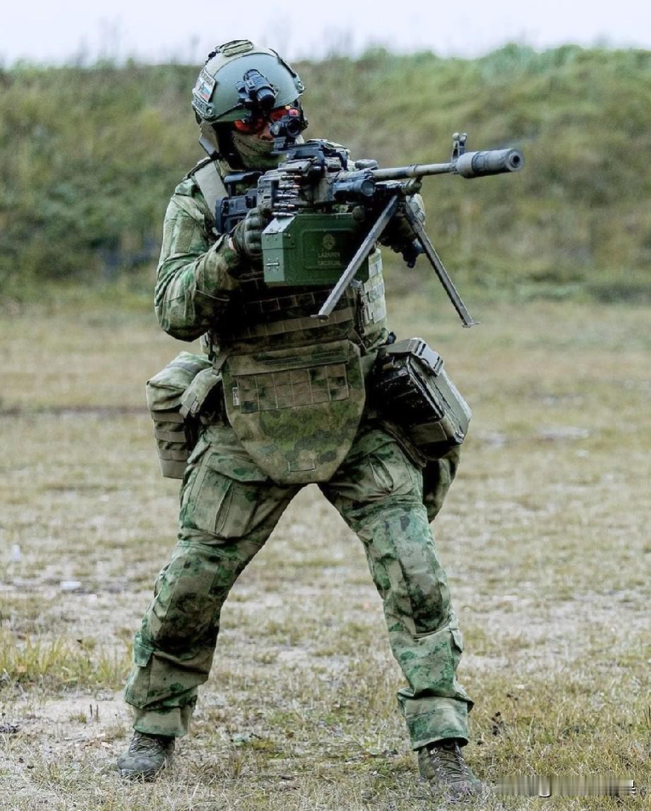 这名俄军特种兵应该最少有八块腹肌吧!不然这20多斤的通用机枪用双手端起来突突,一般人拿起来一会都困难,就别说边走、边瞄准突突了。 恐怕只有腹肌还不行,必须要有超级臂力,才能够达到要求。不然突突的时候,惊人的后座力能把胳膊弄折喽。 看着他拿通用机枪的样子,就像一般人拿AK一样,不得不说非常的强悍。