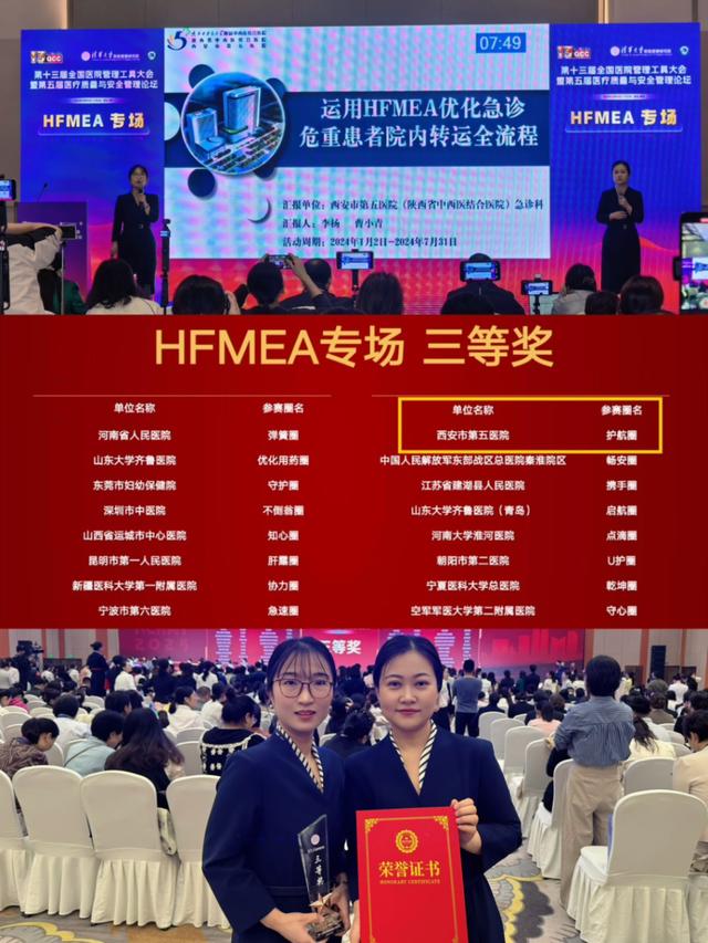 作为国家“十五五”规划(2026-2030年)开篇之际的重要行业赛事,本届大会以“精细管理驱动医疗质量变革”为核心导向,与规划中“推动公立医院从粗放管理向精细化管理转变”的历史性任务高度契合。西安市第五医院急诊科“护航圈”团队携《运用HFMEA优化急诊危重患者院内转运全流程》项目,在HFMEA专场的激烈比拼中,凭借过硬的改善效果与精彩的现场汇报荣获三等奖。该项目精准锚定急诊危重患者转运中的安全风险点,以系统化、科学化的HFMEA管理工具为抓手,全面梳理并优化转运全流程,将规划中“医疗质量安全管理精细化、科学化、规范化”的要求落到实处,为急危重症患者生命安全筑牢“移动防线”。
