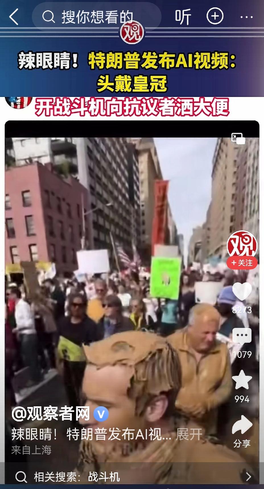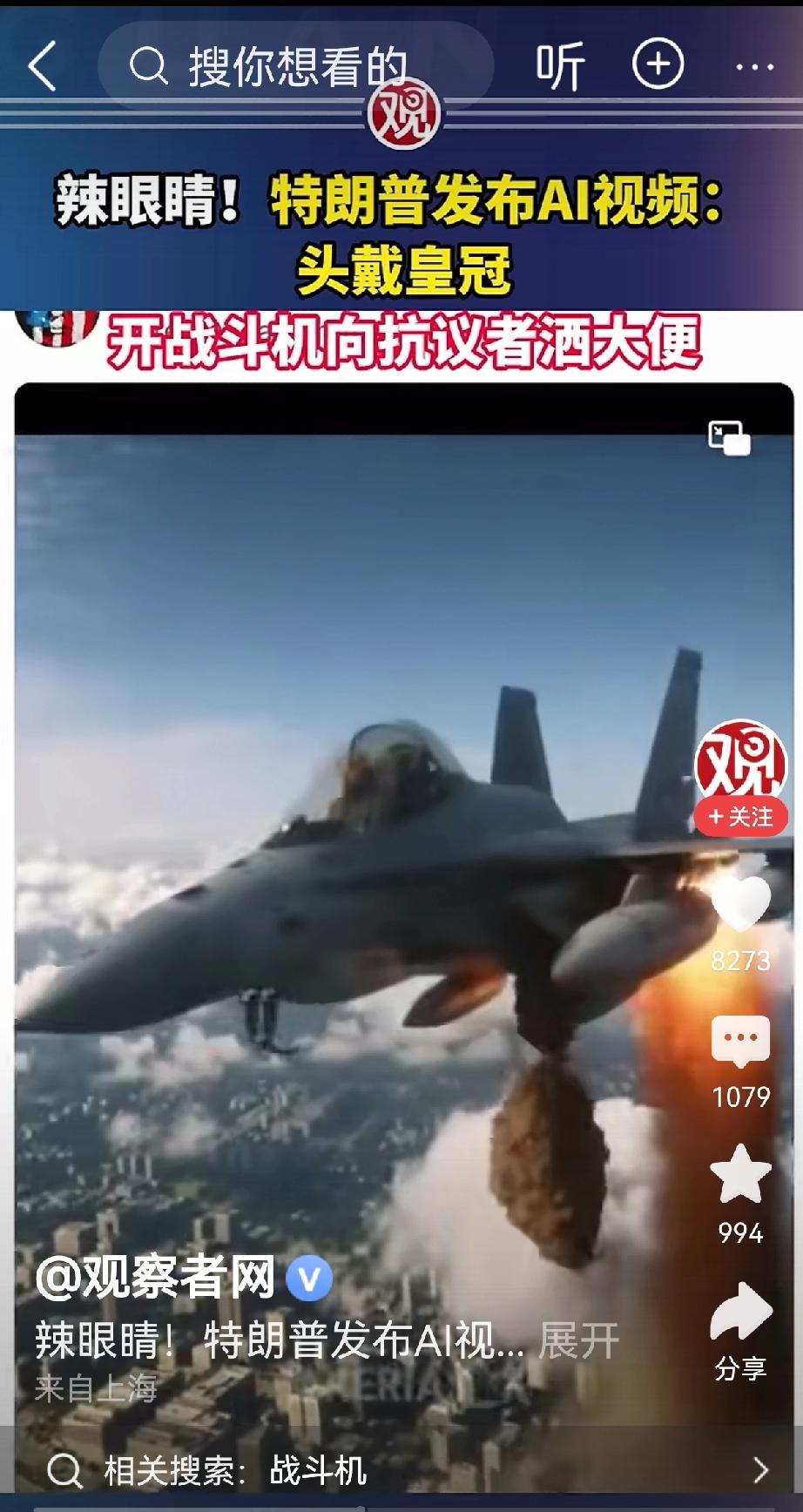 看到这个报道一开始以为是假的,后来真的刷到这个视频了。 哈哈,特朗普还是一个真性情之人,不藏不隐,若是他的团队其他人发布还能理解,但是他本人亲自发布。 特朗普心里想,你们游行反对我,我也有表达我的威胁和愤怒: 你们屎到淋头了![捂脸][捂脸] 我要临空飞翔了![捂脸][捂脸]