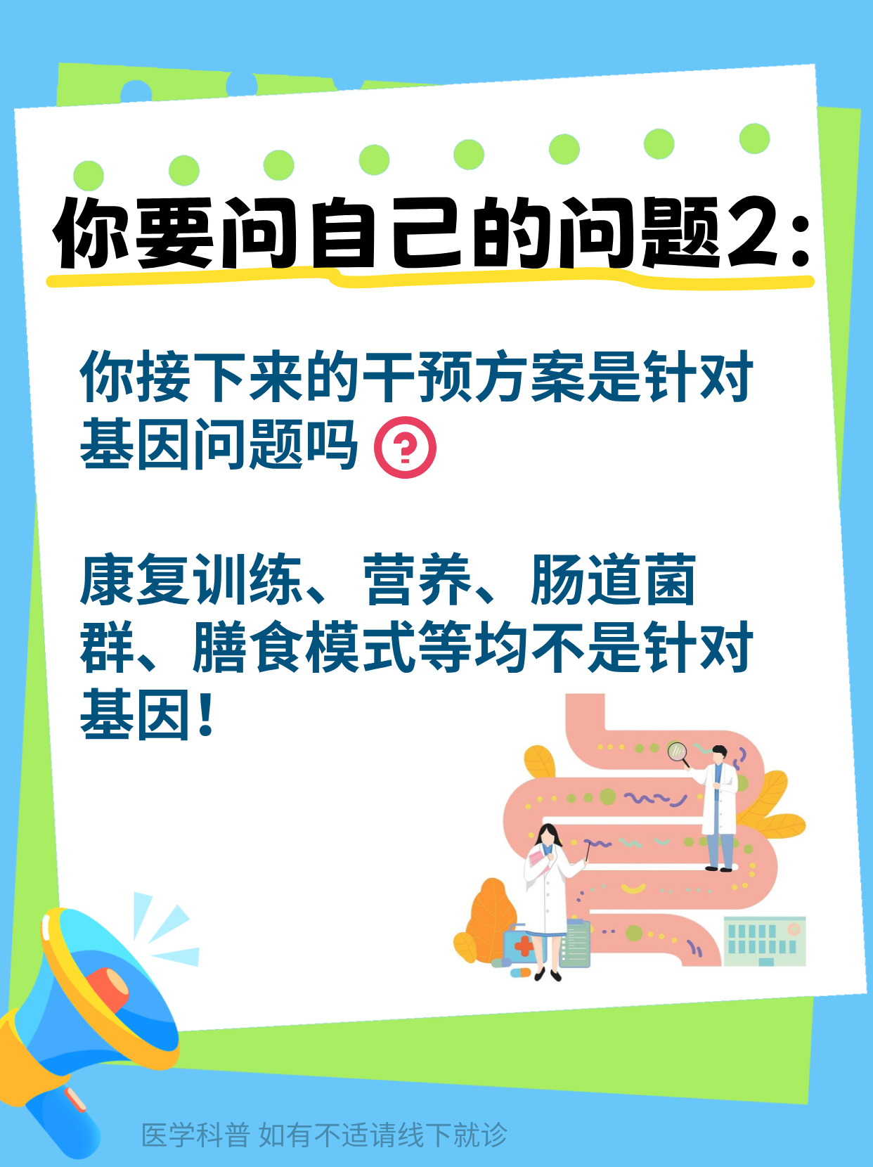 最近很多自闭症患者问,医生,基因检测好贵啊,这个是必须做吗? 其实做不做这个检测和大家接下来要做什么事情,达到什么目的有关系。 首先必须肯定,基因检测是有可能发现一些问题,同时针对一些特定的基因能够通过一些其他方式弥补它的不足,比如之前清华大学发表的一个研究,自闭症基因MEF2C(它导致了大脑免疫出问题,进而造成自闭症),这时候你通过现有的手段改善大脑的免疫其实就有不错的效果,另外也有关于导致大脑RT过于兴奋的基因导致自闭症,虽然没有药物但是你通过生活方式、营养、菌群等方式也是能起到一定作用,基因检测有一定的意义和帮助。 但各位家长也得先接受基因检测目前的局限,我知道很多家长有这样的心理“基因检查很贵,而且查了也没办法,基因改不了,宁愿多花在干预”。 这个无可厚非,基因检测有什么局限这里图文我说了,也是比较客观。另外是否做这个基因检测,你得问问自己这2个问题,相信你问完后就能有自己的答案。 1.你家族是否有自闭症以及神经发育性障碍等病例,你是否要二胎? 2.在你力所能及范围内,你接下来的干预是否能针对基因进行?