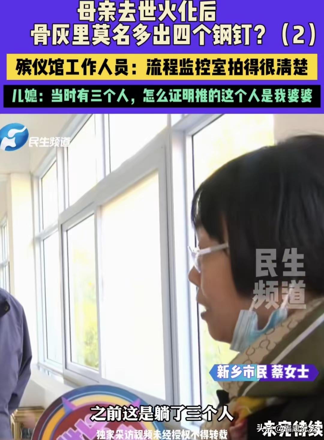 90岁老人火化惊现4根钢钉牵出殡仪馆监控离奇缺失2分钟!河南新乡家属握铁证泣血追问:谁偷走了我婆婆的人生终章? 来源:综合当事人陈述、殡仪馆回应及警方通报 那个装着骨灰的盒子本该是最后的归宿,可当蔡女士颤抖着手拨开灰白色的碎屑时,四根泛着冷光的钢钉像尖刀扎进眼眶。九十岁的婆婆缠绵病榻多年,连手术台都没上过,病历和磁共振胶片至今锁在抽屉里,白纸黑字写着“无植入物”。可如今,这些长达指节的金属物件,竟在烈火焚烧后诡异地从遗骸中浮现。 殡仪馆的工作人员起初坚持“火化流程绝对规范”,直到家属要求调取监控。那段本应记录老人最后旅程的影像,偏偏在遗体转运的关键节点断了片——整整两分钟的黑屏,官方解释是“线路老化”。可什么样的巧合,能让监控恰好失灵在棺椁交接的瞬间?老人生前瘦弱的身体如何能承受四根钢钉?若骨灰并非婆婆,那真正的亲人又流落何方? 更令人脊背发凉的是,钢钉的形态明显属于骨科固定器械。若真如家属所言老人从未手术,这些金属从何而来?是多年前某次隐秘的医疗事故,还是火化环节混入了他人遗体?当质疑的矛头指向殡仪馆,对方仅以“等待警方调查”搪塞,而关键证据的缺失让真相扑朔迷离。蔡家人把婆婆的遗体暂存冰柜,如同守护一个被篡改的谜题。 纵观事件全程,最刺痛人心的并非钢钉本身,而是生命尊严被轻易践踏的荒诞。从医院到殡仪馆,每个环节本应有严苛的流程保障,可当监控能“选择性失灵”,当家属手握医学证明却换不来一句坦诚,我们不得不怀疑:究竟还有多少双看不见的手,在操控生死的最后一程? 此事在社交媒体引爆声浪,不仅因事件离奇,更因它撕开了公共服务体系的裂痕。网友愤慨追问:若线路老化属实,为何不提前检修?若流程无误,为何不敢公开完整影像?当生命的终章被涂改,当哀悼变成刑侦,每一个旁观者都仿佛看见自家老人可能遭遇的危机。 目前警方已拷贝剩余监控开展调查,但公众的焦虑并未消退。这件事早已超越个体悲剧,成为检验社会守护生命尊严能力的试金石。我们期待真相,更期待所有人在生命终点都能获得应有的尊重——毕竟谁都不愿在亲人的骨灰里,发现陌生人的故事。 90岁老人火化 骨灰惊现钢钉 殡仪馆悬案 生命尊严何在