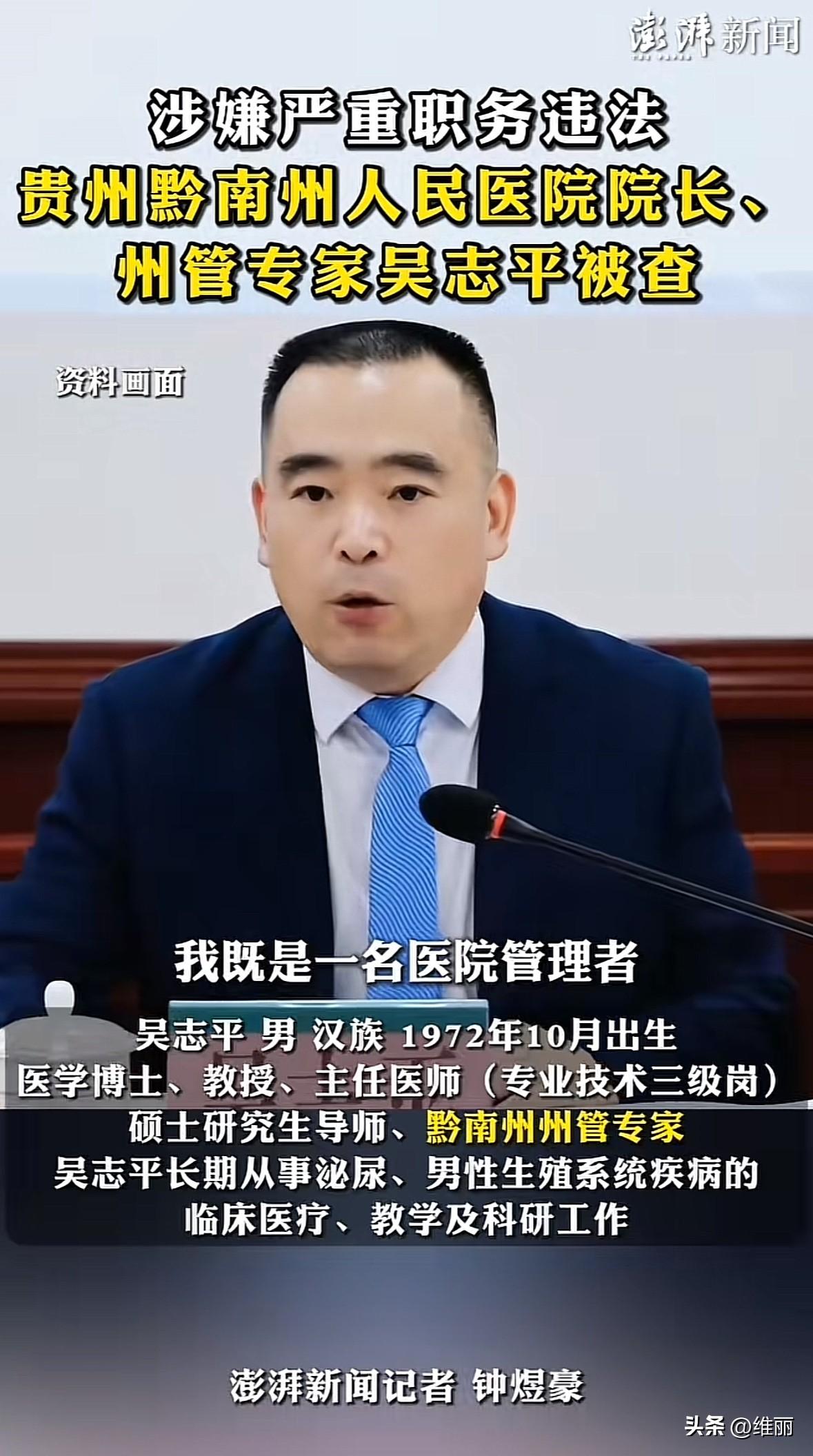 2025年11月5日,贵州黔南州纪委监委通报,黔南州人民医院院长吴志平涉嫌严重职务违法,正接受监察调查。吴志平1972年出生,医学博士、主任医师,是州管专家,享受省政府特殊津贴,2019年起任医院院长,还兼任多职,曾带领团队开展多项黔南首例手术。 医疗领域关乎群众切身利益,手握职权者更该守住底线。不管学术和专业能力多强,一旦触碰职务违法红线,终将被查处。这也说明反腐不设门槛,任何岗位都没有特权,只有坚守初心、依法用权,才能真正服务群众,赢得信任。