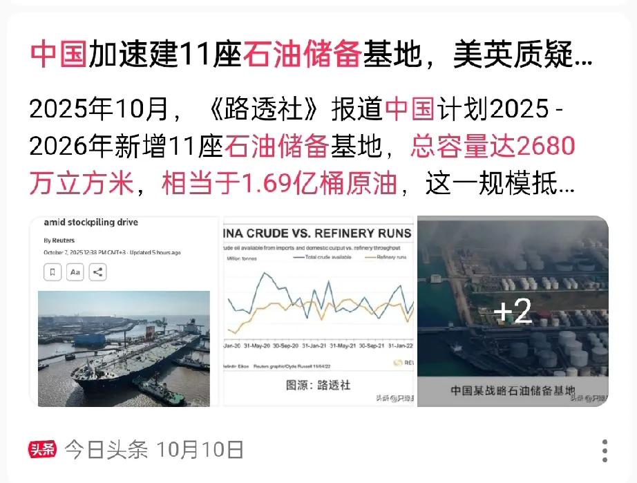 每天超100万桶入库!中国正加速充实石油储备。 数据显示,今年前三季度,我国每日进口原油超1100万桶,已超过沙特日产量。行业分析指出,其中每日约有100多万桶被用于增加储备。 有分析认为,乌克兰局势持续影响俄罗斯石油设施,加上当前国际油价处于低位,是中国加大进口的短期动因。而从更长远看,中国持续提升战略石油储备,预计这一趋势将延续至2026年。 这不仅为应对可能的短期供应中断提供了缓冲,也反映出我们在能源安全上的未雨绸缪。从增储石油到囤积黄金,一系列举措都在为防范地缘风险做足准备。 对此你怎么看?