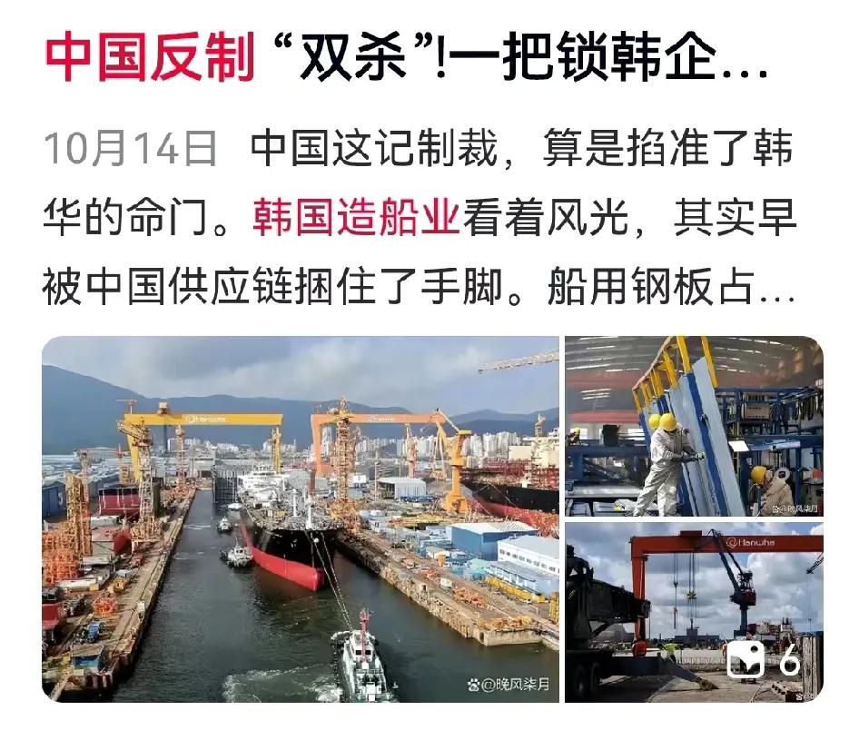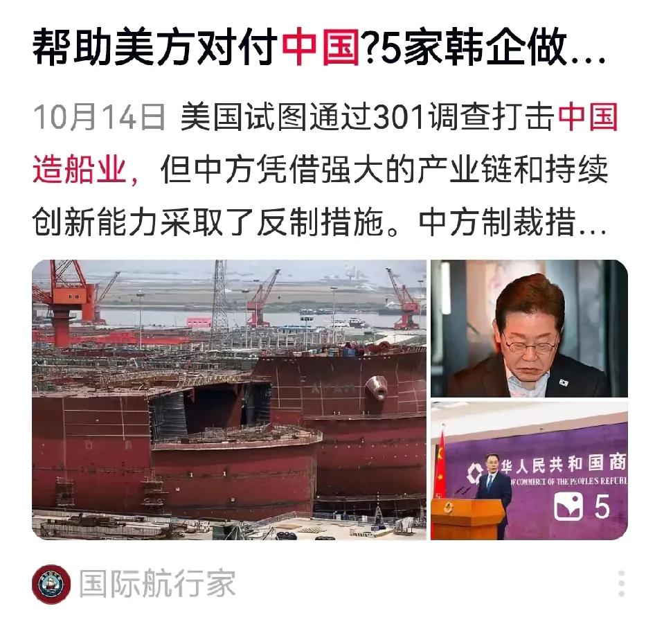 韩国押注美国造船业,结果被原材料卡住了脖子! 中美造船博弈正酣,韩国却贸然签下1500亿美元对美造船合作,韩华、现代、三星纷纷赴美建厂。看似抱紧大腿,却忘了命脉握在谁手里。 韩国造船业70%高端钢板、90%重稀土、LNG船核心部件都依赖中国。中方一反制,韩企立刻告急:韩华遭限,现代重工稀土仅够45天,三星回收也来不及。韩华CEO紧急赴华加价求货,被婉拒;转购日本钢材,价格暴涨近3倍,成本激增近19%,订单面临违约。 本想以投资换技术,却陷入两难:靠美,产业链撑不住;靠华,又怕得罪盟友。这场豪赌已露败象——大国博弈中,硬赌站队只会两头空。不断合作底线,才是生路。 对此你怎么看? 中美造船 韩国造船业