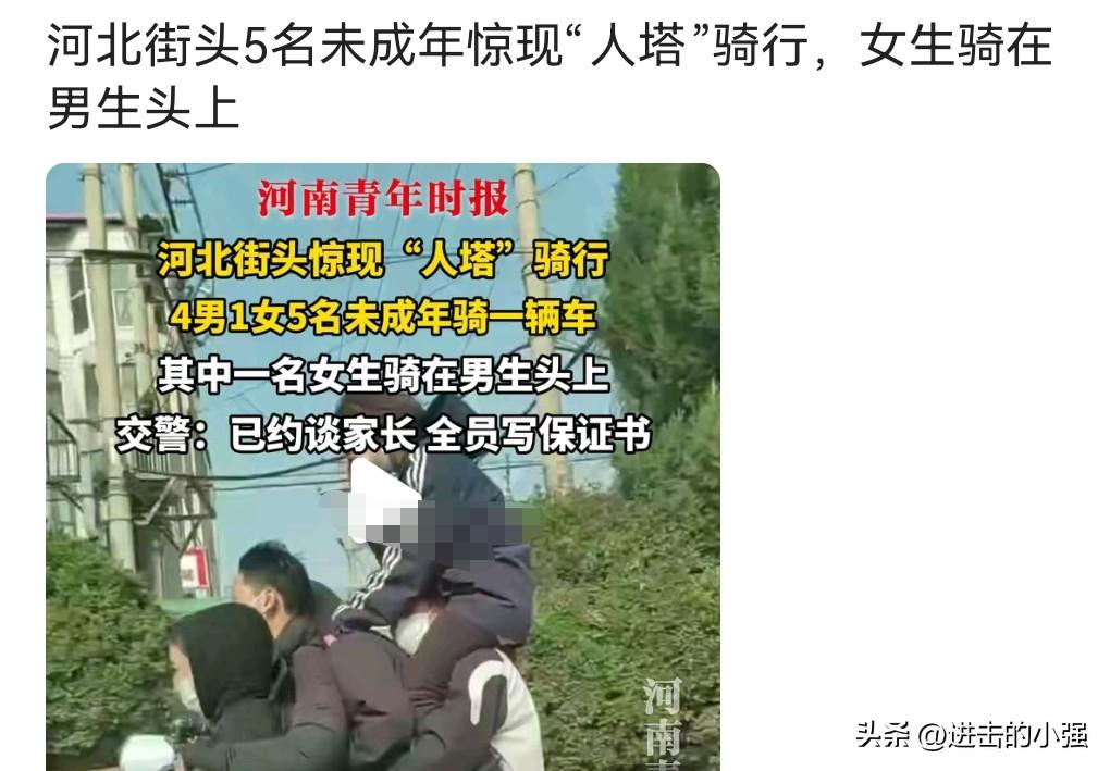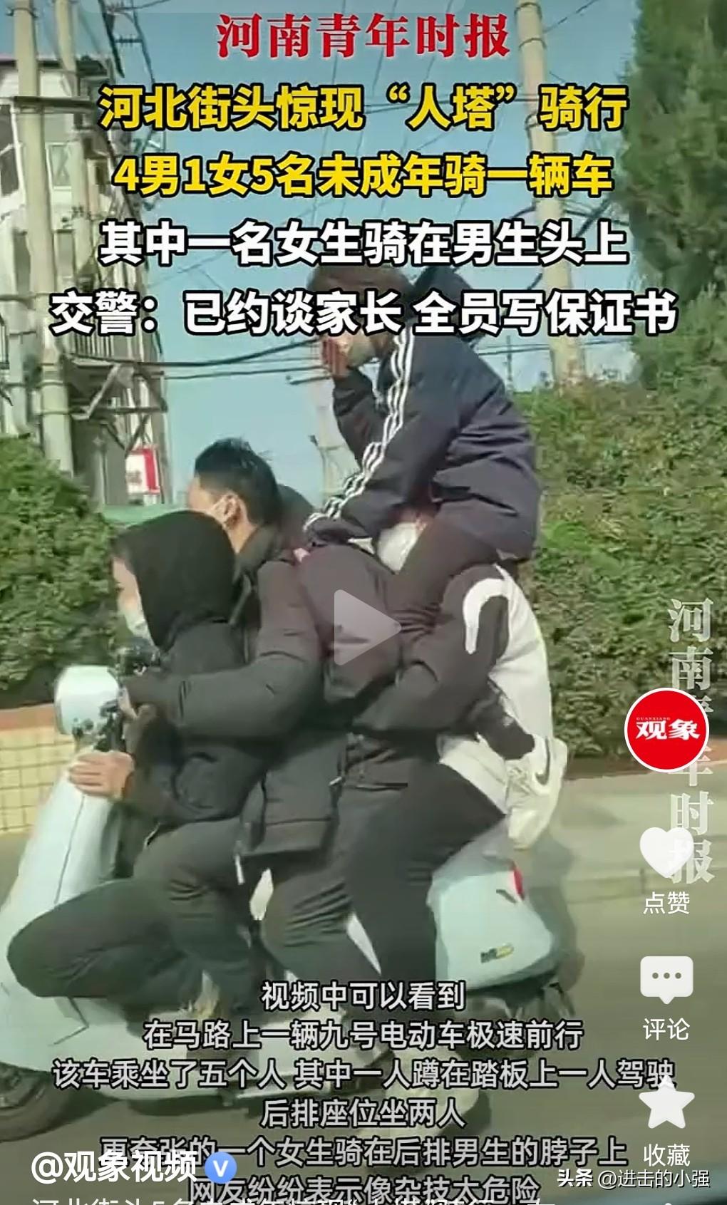 这真是开了眼了,如果不是在网上亲眼所见,我是万万不敢相信,还有这样的情况发生。 近日,河北,5个未成年人,骑一辆共享电动车。 其中最夸张的是有一个男生的头上还骑着一个女生。 这真的是太不要命了。 典型的无知无畏呀,幸好没出交通事故,要是出个交通事故,那后果真是不堪设想。 最终几个人被谈话,写了保证书。