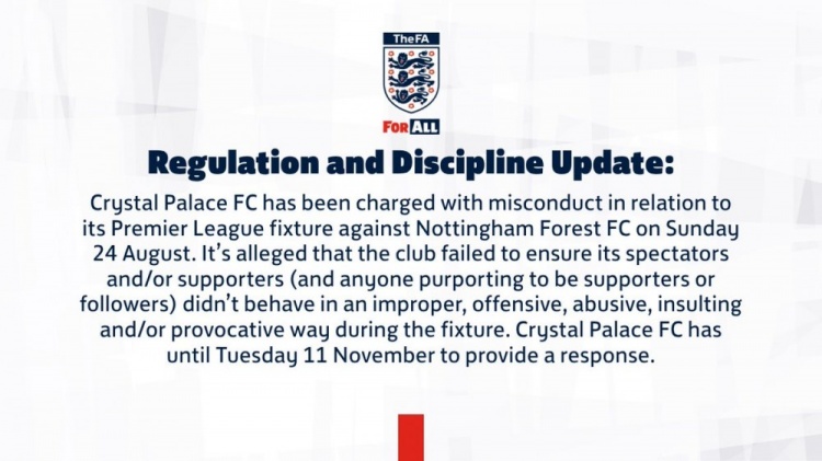 公告内容:“水晶宫足球俱乐部因8月24日对阵诺丁汉森林足球俱乐部的英超联赛中存在不当行为而受到指控,该俱乐部未能确保其观众及/或支持者(以及任何自称支持者或追随者的人员)在比赛期间避免采取不当、冒犯性、辱骂性、侮辱性及/或挑衅性行为。”