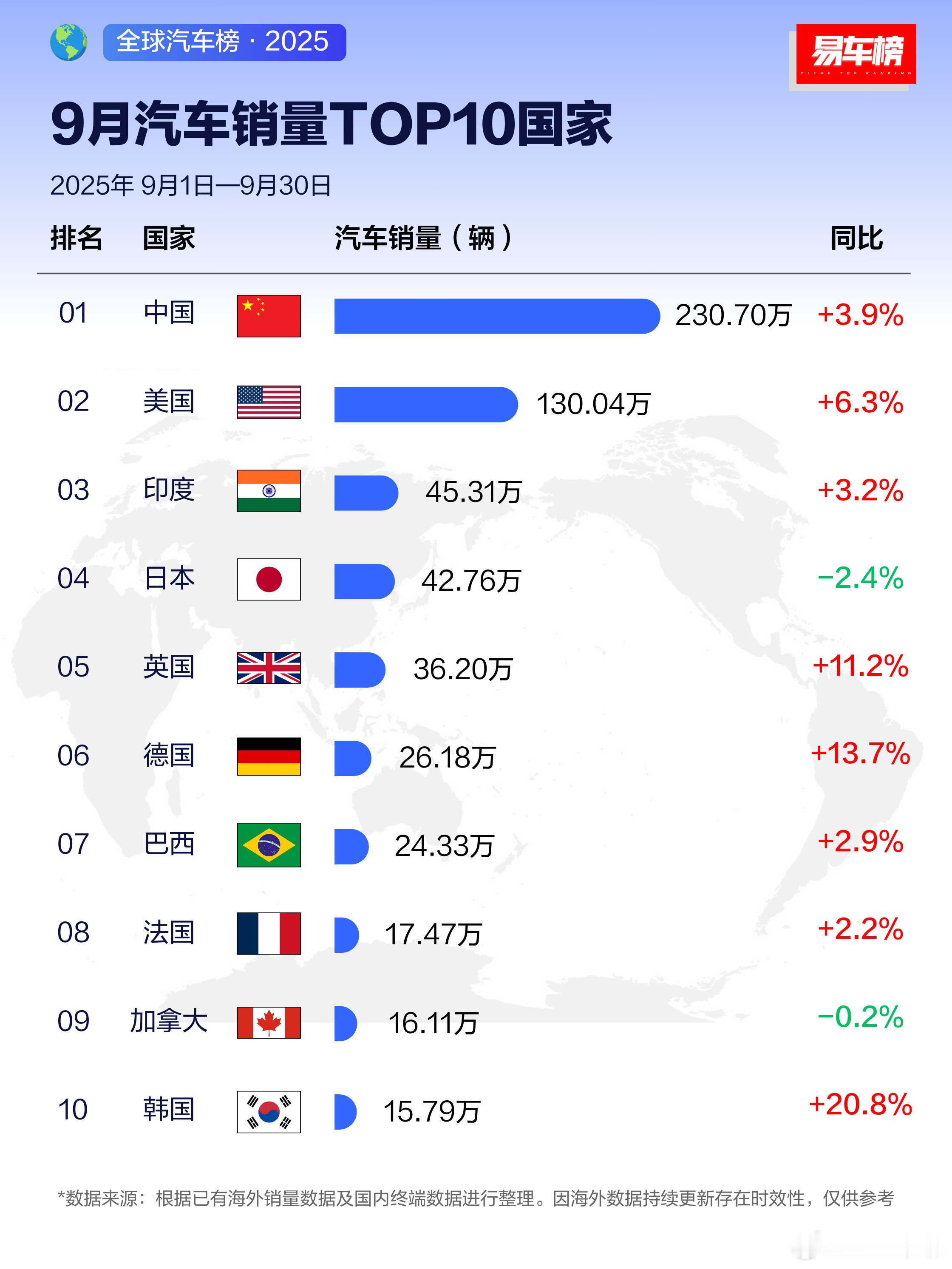1-9月,汽车本土销量(国家),中国毫无疑问的是榜首。