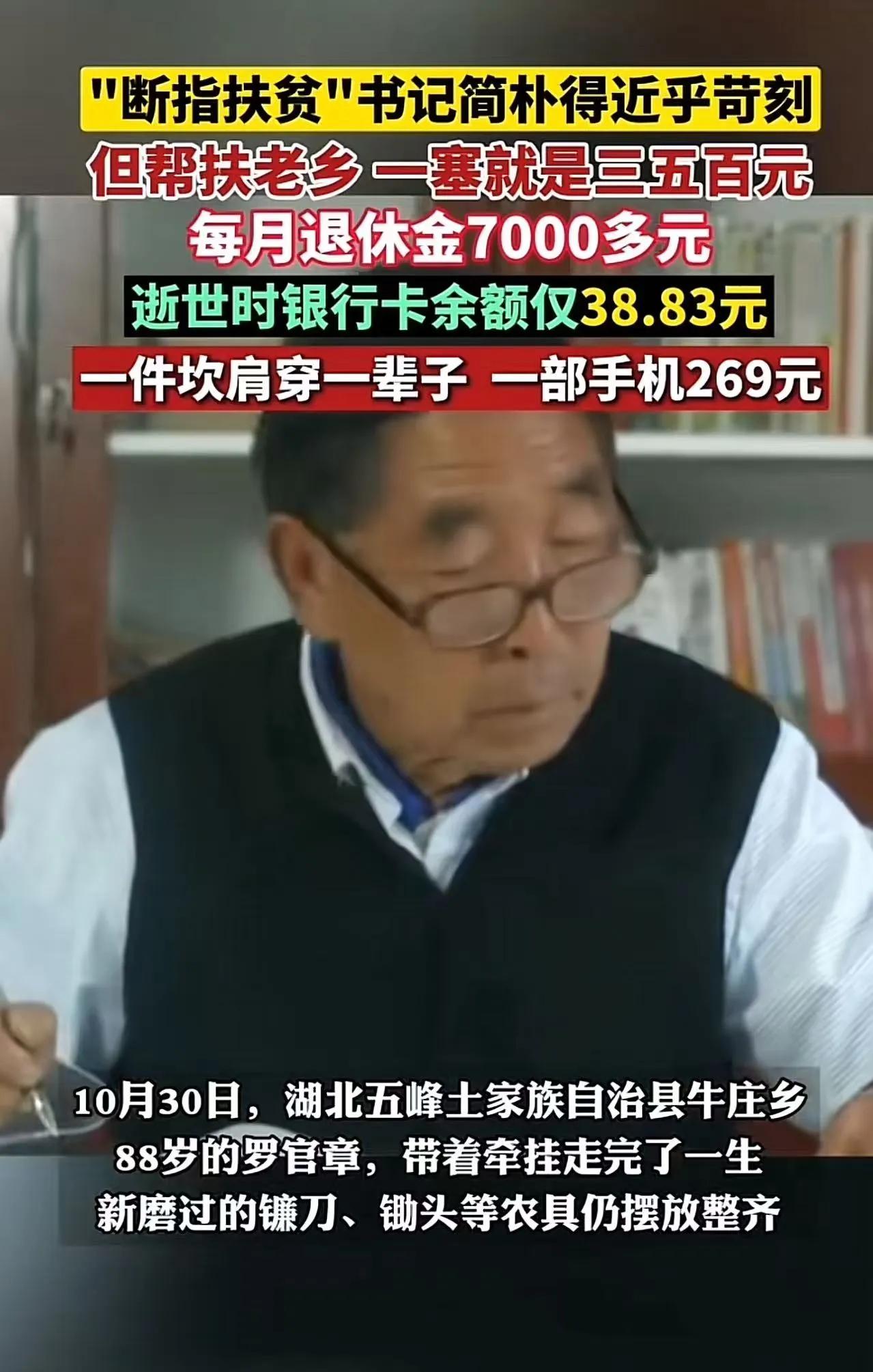 村书记去世了,走完了人生路,银行卡里的余额让全村人震惊! 近日,湖北五峰土家族自治县牛庄乡老书记——88岁的罗官章,闭上了双眼,走完了他为乡亲们辛勤忙碌让全村人永远难以忘怀一生。 但令人难以置信的是,老书记的账户余额竟然只剩下38.83元。这个数字像是一记重击,让所有人都陷入沉思:一个曾经用一生去奉献、用心去守护这片土地的老人,最后的财产竟然如此微不足道。这背后,隐藏着怎样的故事?又折射出怎样的人性光辉? 有人说,老书记的钱花得都在了乡亲们的身上。他的生活虽简朴,却用无私的爱温暖了整个村庄。每当村里有人遇到困难,他总是第一个出现,用自己微薄的积蓄帮一把,哪怕自己生活拮据,也从未考虑过自己的利益。这种精神,令人动容,也让人反思:真正的财富,难道不是那些用爱和善良积累起来的记忆和感动吗? 然而,也有人在背后偷偷议论:老书记的钱都花哪去了?是不是没有存下一点?其实,这正是人性的复杂与深邃——有人会因为物质的贫乏而疑惑,有人会因为心中的善良而感动。我们常常把“财富”理解为金钱的多少,却忽略了那些用爱铺就的“财富”——无价的信任、温暖的微笑、无私的奉献。 老书记用一生诠释了什么叫“心存善良,乐于助人”。他没有积攒多少金钱,却用行动证明了:真正的价值,不在于拥有了多少,而在于付出了多少。或许,他的账户余额只有38.83元,但在村民们心中,他的财富却是无价的——那是一份用生命书写的爱与责任。 这件事情也让我们每个人都开始反思:我们在追求物质的同时,是否也在无形中失去了些什么?是不是我们也应该像老书记一样,用自己的行动去温暖身边的人,用心去守护那份最纯粹的善良?毕竟,真正的幸福,不在于拥有的多寡,而在于付出的多与爱心的深度。 读完这个故事,你是否也感受到了一股暖流?也许,我们都可以从老书记的身上学到些什么:在平凡中坚守,在简单中伟大。因为,最伟大的财富,往往藏在那些无声的善行里。让我们用心去体会,用行动去传递,让这份温暖,延续在每一个角落。农民离世遗产
